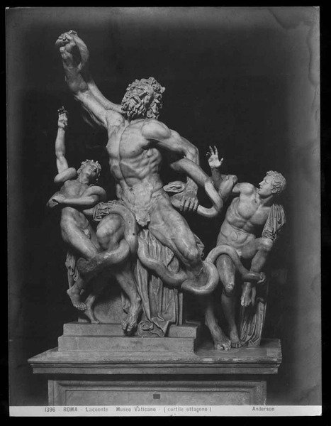 <p>26x20 cm, fotografia in b/n  di Lacoonte e i suoi figli scolpita nel I° secolo a.C. nelle bottega rodia di Alesandro, Atanadoro e Polidoro. Alla base della foto : " n. 1396 Roma Lacoonte Museo Vaticano (Cortile Ottagono) Anderson".Sul retro due timbri Musei e opere pontificie  e G. P. L. 3.50"</p>