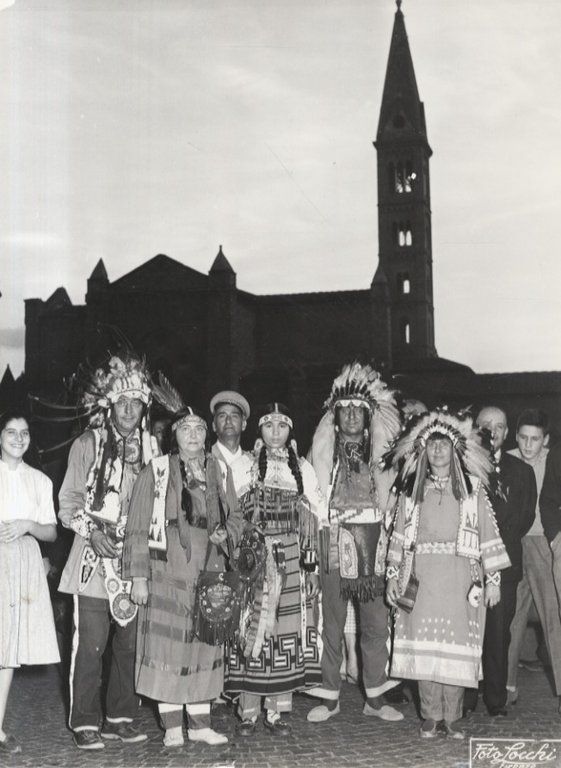 Fotografia originale in b.n., formato mm. 127x240 raffigurante un gruppo di 6 persone (2 uomini e 3 donne) travestiti da pellerossa, in primo piano; con loro altre vestite in abiti civili; sullo sfondo si staglia il profilo d'una chiesa (sembra la Basilica di S. Maria Novella, lato stazione).
