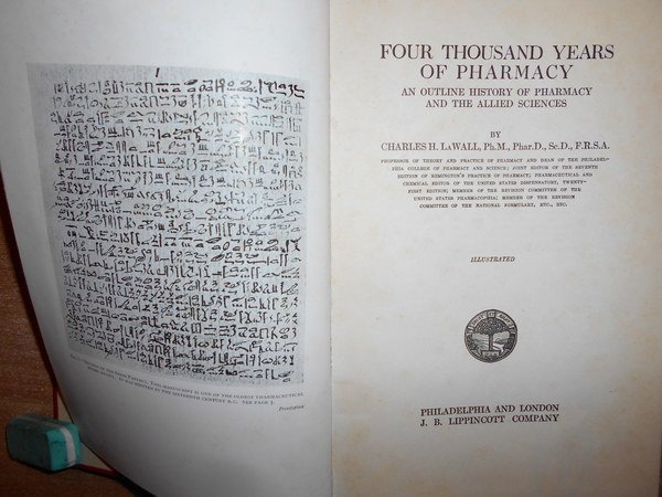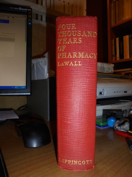 Charles, LaWall. Philadelpia and London J. B. Lippincott Company, 1927. Four Thousand Years of Pharmacy. Illustrated. In-8° piccolo, tela rossa edit. e oro, taglio superiore rosso. xv, 665 pp. con numerose tavole fuori testo. Ottimo esemplare dell' edizione originale. Uff. C - IV - 6