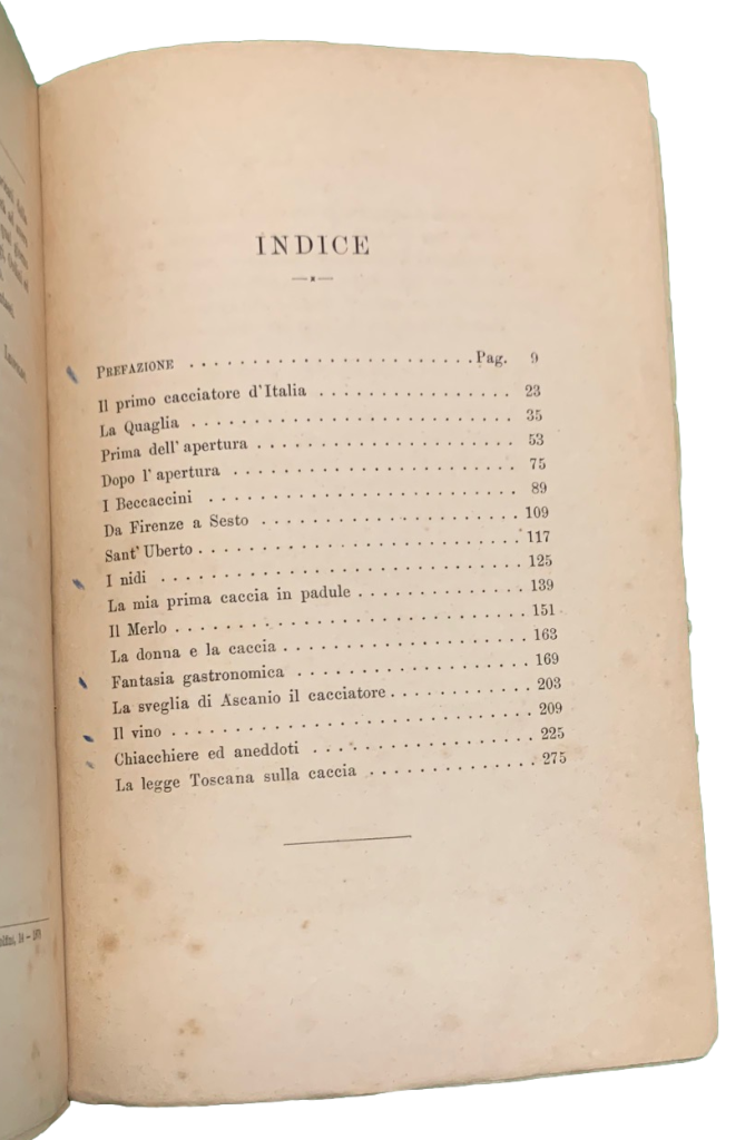 In 8°; 288, (2) pp. Brossura editoriale con tiolo, autore, editore e fregio a tema venatorio, impresso in rosso e nero entro cornice al piatto anteriore. Rinforzo in carta marmorizzata al dorso. Dedica autografa dell'autore alla prima carta bianca. Qualche macchiolina, qualche lieve fioritura, non significativa e nel complesso in buone condizioni di conservazione. Prima rarissima edizione, una seconda edizione assai più comune uscì nel 1905, di quello che è considerato il primo libro italiano di memorie sulla caccia scritto da quello che è considerato l'iniziatore della moderna letteratura venatoria italiana Arturo Renault. L'autore, di origine francese, era figlio del capo-guardiacaccia delle Reali Tenute della Veneria chiamato direttamente da Vittorio Emanule II. Arturo Renault, da autodidatta, imparò la lingua italiana. A lui si devono numerose opere e diversi articoli venatori su vari quotidiani e periodici che a partire dal 1870 erano apparsi in Italia. Celebri sono i suoi articoli sulla rivista Diana (della quale fu anche direttore). La sua opera letteraria gli diede notevole fama nel mondo venatorio italiano ed europeo. Questi articoli erano di solito formati con lo pseudonimo di "Rusticus". Renault, nel 1873, pubblicò il suo primo opuscolo "Ai Cacciatori", quasi sconosciuto oggi ma che dava, formalmente inizio alla letteratura venatoria italiana. Seguì nel 1877 il volume "La caccia e i cacciatori" che però era una raccolta degli articoli di Renault apparsi sulla Gazzetta d'Italia. Il libro ebbe enorme successo. Ma è proprio il volume qui presentato ad essere, generalmente, considerato il primo volume italiano di racconti venatori. L'opera è composta da 16 capitoli di ricordi venatori ed aneddoti illustrati in un linguaggio vivace e piacevole. Un capitolo è dedicato anche al vino. Questa primissima edizione è arricchita anche dalla firma autografo dell'autore. Rarità bibliografica. Rif. Bibl.: IT\ICCU\SBL\0058598.