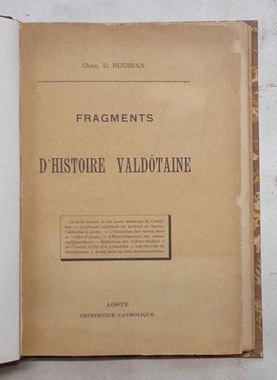 In 8° (cm. 21 x 14,5); pagg. 126; mezza similpelle moderna con titoli in oro al dorso e brossura originale conservata all'interno. Esemplare a pieni margini. VG. ** Edizione originale e unica. Cfr. Sistema Bibliotecario Valdostano. Contiene, tra l'altro, un saggio sul ponte romano e i ponti moderni di Chatillon, l'estinzione dei censi in Valle d'Aosta e in particolare a Valtournenche e nella baronia di Aymavilles, le opere di beneficenza ad Aosta negli ultimi tre secoli., estinzione dei tributi feudali nella signoria di Saint- Vincent