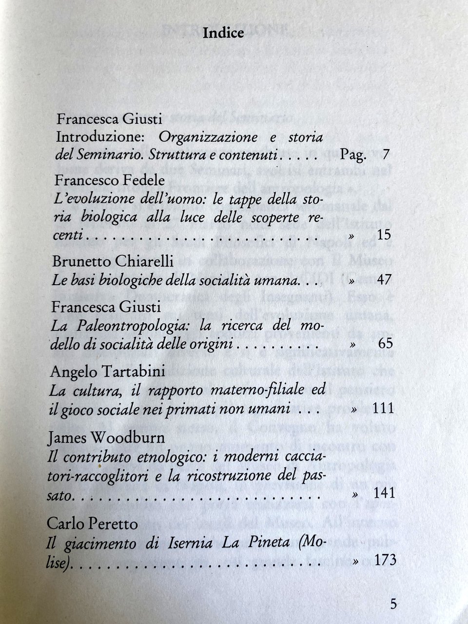 Soggetti: Antropologia Convegni Studi culturali Seminari Evoluzione umana Paleoantropologia Relazioni Dubois Giava Primo fossile umano Homo erectus Fossili Tecniche molecolari Genetica Specie Biologia Socialità Organizzazione sociale Gruppo animale Aggregazione Materno/filiale Sessualità Cibo Difesa Gruppi Primati Analisi Vita Archeologia Ricerche Popolazioni Cacciatori Raccoglitori Caccia Tratti Repertorio Comportamentale Ominidi Scimmie antropomorfe Trasmissione culturale Comportamento Individui Apprendimento Gioco Radici Conoscenza Lavoro Ritorno Differenziazioni Egualitarismo Meccanismi Disuguaglianze Anziani Giovani Uomini Donne Moderni Milioni Posizione eretta Piede Arrampicatori Foresta Dita Tappe Scoperte Modelli Etnologia Giacimento Isernia Molise Reperti Linguaggio Scimpanzé Psicologia Funzioni Complessità Ruolo Padre Famiglia Patriarcato Matriarcato Esogamia femminile Cooperazione Aggressività Ancestrale Animali Antenati Antichi Africa Australopithecus Babbuini Binford Biologica Bipedismo Raccolta Campo-base Caratteristiche Carne Carnivori Cervello Darwin Uomo Dimorfismo sessuale Femmine Foley Gorilla Hadza Habilis Interpretazione Ipotesi Kung Mammiferi Mammuth Maschi Matrimoniale Mesolitico Modalità Monogamia Neandertaliani Olduvai Paleolitico Parentela Paternità Piccoli Poliginia Predatori Predazione Prede Sapiens Scavenging Schegge Sistema Spartizione Strategie Tecnologia Utensili Bonobo James Clifford Marc Augé Agricoltura Gregg Flannery Scienze naturali Zoologia Naturale Paleontologia Sesso Età Lévy-Strauss Ries Libri rari fuori catalogo Collezionismo Bibliografia Riferimento Austraulopitechi Molecole Ossa Raymond Dart David Pilbeam Trives Conflitto Genitori Prole Cure parentali Svezzamento Barash Vantaggio Madre Kawai Lee Sahlins Tanner Tooby Washburn Benford Isaac Toth Chelidonio Teorie Scavenger Choppers Armi Strumenti Lupi Bluffer-Hrdy Boesch Goodall Hinde McGrew Savage Rumbaugh Aborigeni Esquimesi Pigmei Sistemi sociali Alberto Solinas Stratigrafia Anconetani Giusberti Coltorti Cremaschi Preistoria Anthropology Conferences Cultural studies Seminars Human evolution Paleoanthropology Relations Java First Fossils Molecular techniques Genetics Species Biology Sociality Organization Animal group Aggregation Maternal Filial Sexuality Food Defense Groups Primates Analysis Life Archaeology Research Populations Hunters Gatherers Hunting Traits Behavioral repertoire Hominids Apes Transmission Behavior Individuals Learning Play Roots Knowledge Work Return Differentiations Egalitarianism Mechanisms Inequalities Elderly Young Men Women Modern Millions Upright position Foot Climbers Forest Fingers Stages Discoveries Models Ethnology Deposit Finds Language Chimpanzee Psychology Functions Complexity Role Father Family Patriarchy Matriarchy Female exogamy Cooperation Aggression Ancestral Animals Ancestors Ancient Baboons Biological Bipedalism Gathering Base camp Characteristics Meat Carnivores Brain Man Sexual dimorphism Females Gorillas Interpretation Hypothesis Mammals Males Matrimonial Mesolithic Mode Monogamy Neanderthals Paleolithic Kinship Paternity Small Polygyny Predators Predation Prey Splinters System Partitioning Strategies Technology Tools Agriculture Natural sciences Zoology Paleontology Sex Age Rare books out of print Collecting Bibliography Reference Austraulopithecines Molecules Bones Conflict Parents Offspring Parental care Weaning Advantage Mother Theories Weapons Wolves Aborigines Eskimos Pygmies Social systems Stratigraphy Cremaschi Prehistory