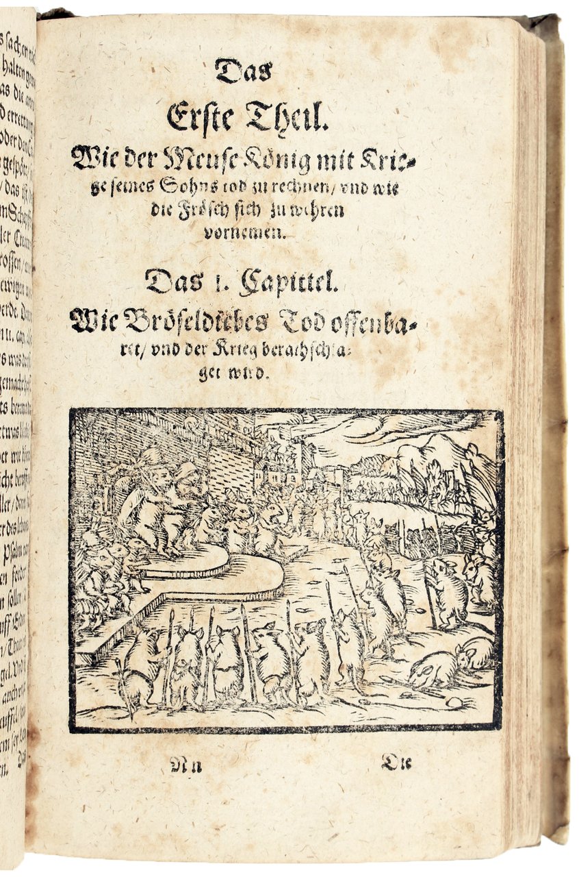 Extremely rare first edition of this didactic-humoristic animal epic, a most singular and remarkable work of German literature between the sixteenth-century and the Baroque period. The work is dedicated to the learned Heinrich Rantzau (1526-1599), then the king of Denmark's representative in the duchies of Schleswig and Holstein. As Rollenhagen points to on several occasions, the work was written for the learned male youth: “Und ihr junge lustige Knaben / Die lust zu ehrbar kurtzweil haben.” (leaf C4v), and summarizes his intention: “Damit im schertz die gute Leer / Bey der Jugend schaff desto mehr ”(leaf C4v) (cf. O. Brunken, Georg Rollenhagens ‘Froschmeuseler' – ein späthumanistisches dikaktisches Tierepos für die Jugend des gebildeten ‘Mittelstandes', in: “Schiefertafel”, 5, 1982, pp. 46-73).