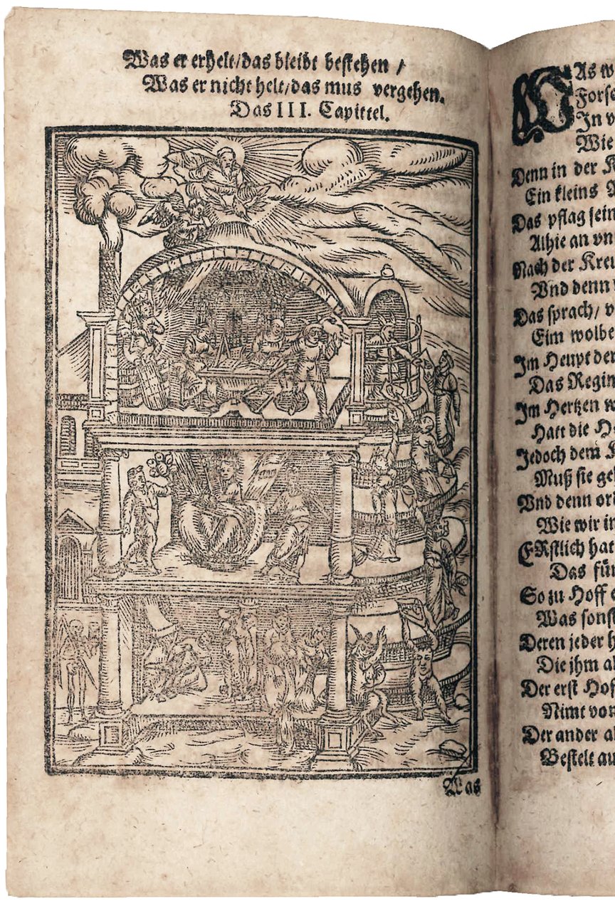 In 1566, when Rollenhagen still was a student at Wittenberg, he had heard Veit Ortel's lecture on the pseudo-Homeric Batrachomyomachia and made a first attempt at a German version. Nearly thirty years later his magnum opus was accomplished and bore little resemblance to the Greek original (who has 305 lines, whereas the Froschmeuseler has over 20,000). The work is divided into three books, the first of which deal with the individual in the society, the second the ideal constitution of a state and the relationship between state and church (here is included a sharp polemic against popery), and the third deals with international relationships, especially war and peace (cf. R. Richter, Georg Rollenhagens Froschmeuseler: Ein rhetorisches Meisterstück, Bern, 1975, p. 61). Rollenhagen did not intend his work to be simply an allegorical polemic. He also conceived it to be an antidote to and a weapon against the Volksbücher as the “weytbrümbter Eulenspiegel / oder auch andere Schandbücher / der Pfaff von Kalenberg / Ratziporus, Rollwagen / etc.” (leaf A8r). He wanted to tell the truth to the world, laughingly, since the world did not seem to care for truth seriously written. The immense pile of fable, proverb, tale, and anecdote woven into the plot proper is shown by the sources he enumerated, which go from the Reinecke Fuchs and Fischart's Flöh Hatz to the Indian Panchatantra (Büch der bÿspel der alten wÿsen, Urach, ca. 1480).