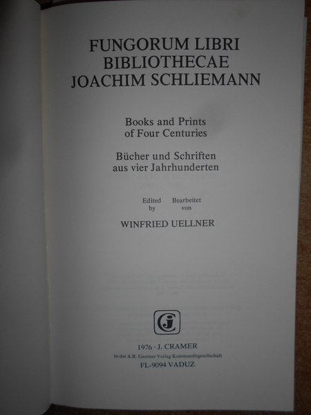WINFRIED UELLNER. Germany, J. Cramer, 1976. Fungorum libri Bibliothecae JOACHIM SCHLIEMANN. Books and Prints of Four Centuries. In-8° piccolo, tela edit. illustrata. 287 pp. con alcune riproduzioni nel testo. Come nuovo. Uff. D - I - 1