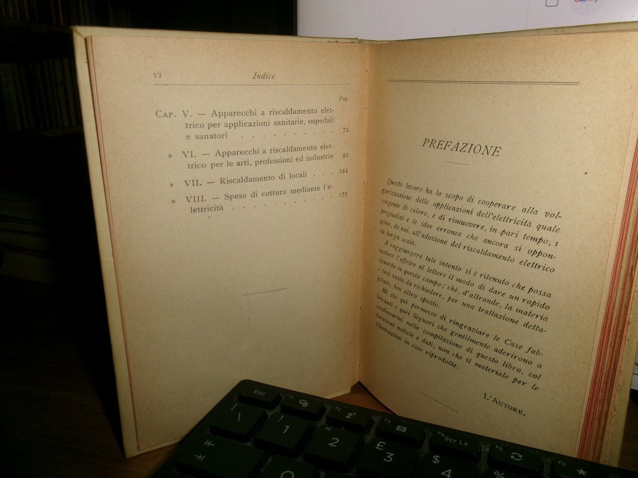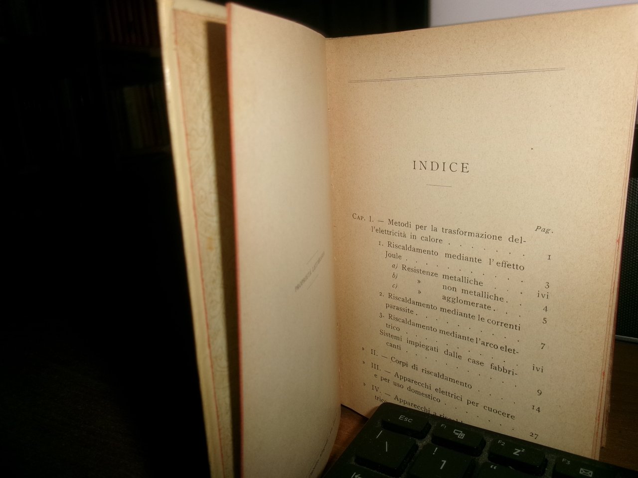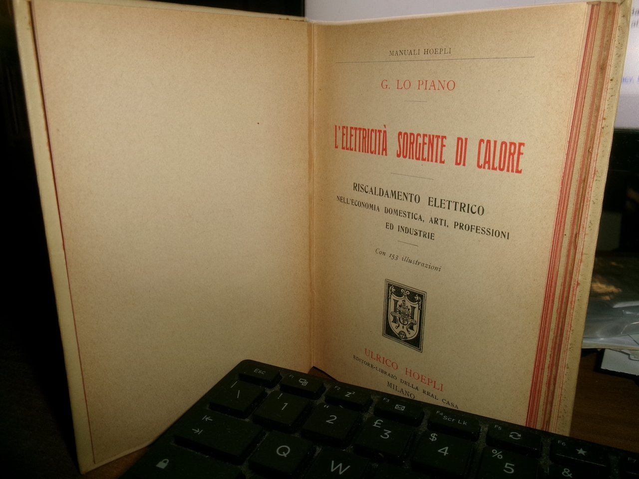G. LO PIANO. L' Elettricità Sorgente di Calore. Riscaldamento elettrico domestico e industriale. Milano, Ulrico Hoepli, 1913. In-16°, tela edit., tagli in rosso. vi, 188 pp. con 153 illustrazioni + 53, (11) pp. (catalogo 1600 manuali Hoepli. Ottimo stato. Neg. scat. ultimi Hoepli