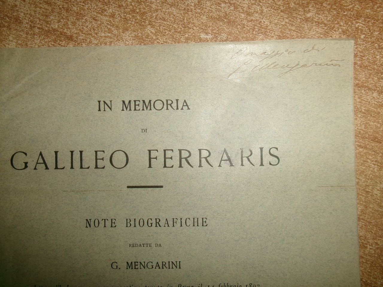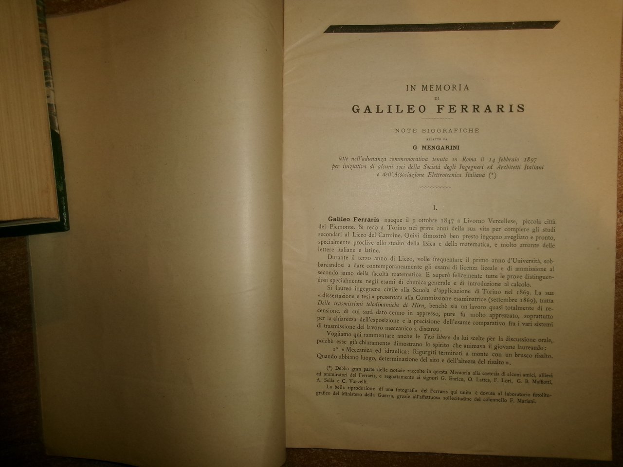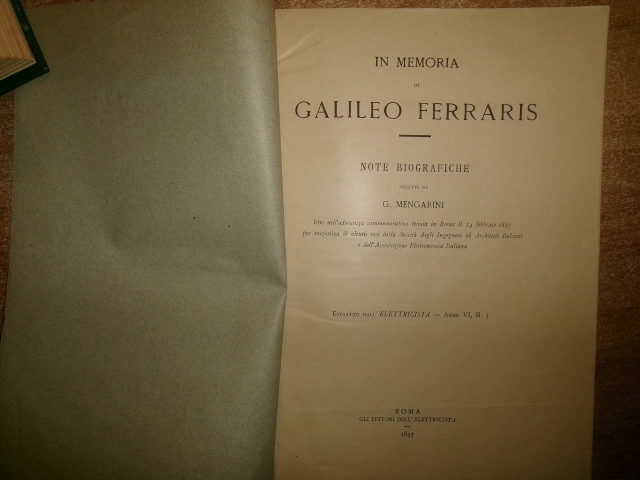 G. MENGARINI. In Memoria di GALILEO FERRARIS - Note Biografiche lette nell' adunanza commemorativa tenuta in Roma il 14 febbraio 1897 per iniziativa di alcuni soci della Società degli Ingegneri ed Architetti Italiani e dell' Associazione Elettrotecnica Italiana. Estratto dall' ELETTRICISTA . Anno VI, n. 3. Roma, Gli Editori dell' Elettricista, 1897. In-8°, br. orig. 20 pp. Opuscolo ben con servato con firma dell' Autore. Neg. mob. 4 entro busta trasp.