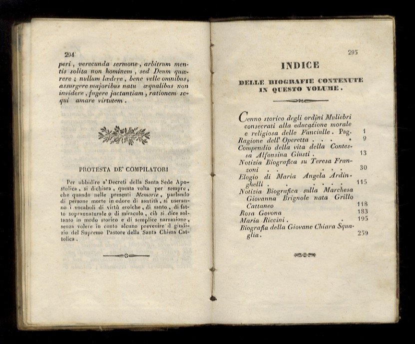 Faoligno, Tipografi Tomassini, 1841, in-16, legatura coeva in mezza pelle, titolo in oro al dorso, tagli colorati e spugnati, pp. [4], 295, [3]. Uscirono tre volumetti della "Galleria di giovanette illustri italiane", ciascuno dei quali può stare a sé; le biografate in questo volume sono: contessa Alfonsina Giusti, Teresa Franzoni, Maria Angela Ardinghelli, marchesa Giovanna Brignole, Rosa Govona, Maria Riccini, Chiara Squaglia. Lievi tracce d'uso esterne ma buon esemplare.