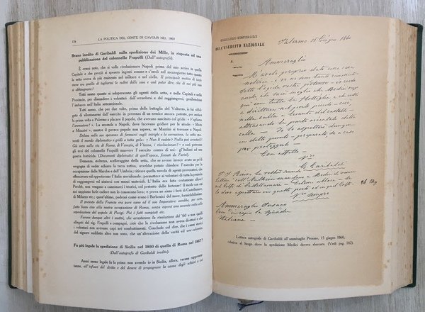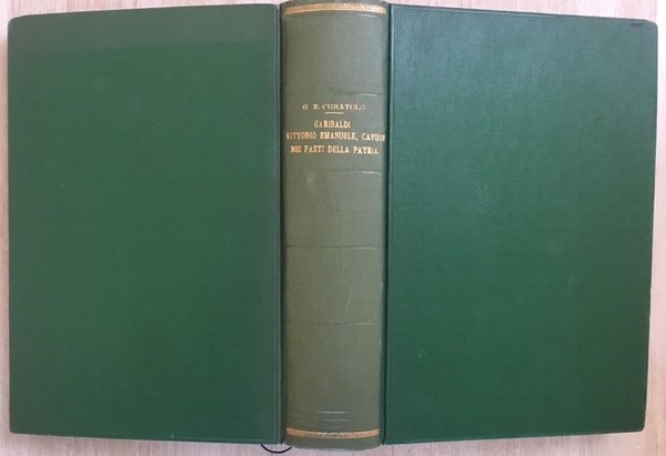 20,5x19,5 cm; XXVI, (2), 445, (3) pp. e 64 c. di tav. fuori testo alcune più volte ripiegate. Bella legatura coeva editoriale in tutta tela verde con titolo e fregi in oro al dorso. Piccolissime macchioline di foxing non fastidiose, in genere al margine esterno bianco, dovute alla qualità della carta e per il resto ottimo esemplare in bella legatura. Prima edizione di questo testo che presenta lettere e scritti inediti di grandi personaggi del Risorgimento italiano conservati nella collezione privata di Giacomo Emilio Curatulo noto storico originario di Marsala (Trapani). Le lettere si riferiscono in particolare all'epoca dell'impresa dei mille. Opera monumentale in ottime condizioni e bella legatura.