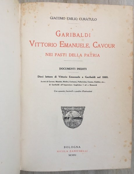 GARIBALDI, VITTORIO EMANUELE, CAVOUR, NEI FASTI DELLA PATRIA. DOCUMENTI INEDITI, DIECI LETTERE DI VITTORIO EMANUELE A GARIBALDI nel 1860. Scritti di Cavour, Mazzini, Medici, Cattaneo, Pallavicino, | Libri antichi e moderni | Curatulo Giacomo Emilio