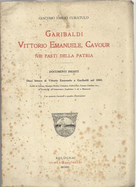 In 8 (29x21) brossura; 448 pp, segni del tempo e fioriture in copertina, piccoli strappi sul dorso, pagine ancora intonse con bruniture e leggere fioriture, comunque in buone condizioni. Ed. 1911, I documenti (lettere) si riferiscono all'epoca dell'impresa dei mille. Contiene dieci lettere di Vittorio Emanuele a Garibaldi nel 1860 e inoltre scritti di Cavour, mazzini,Medici, Cattaneo, Pallavicino, Cosenz, Bismark . Con sessanta facsimili di lettere