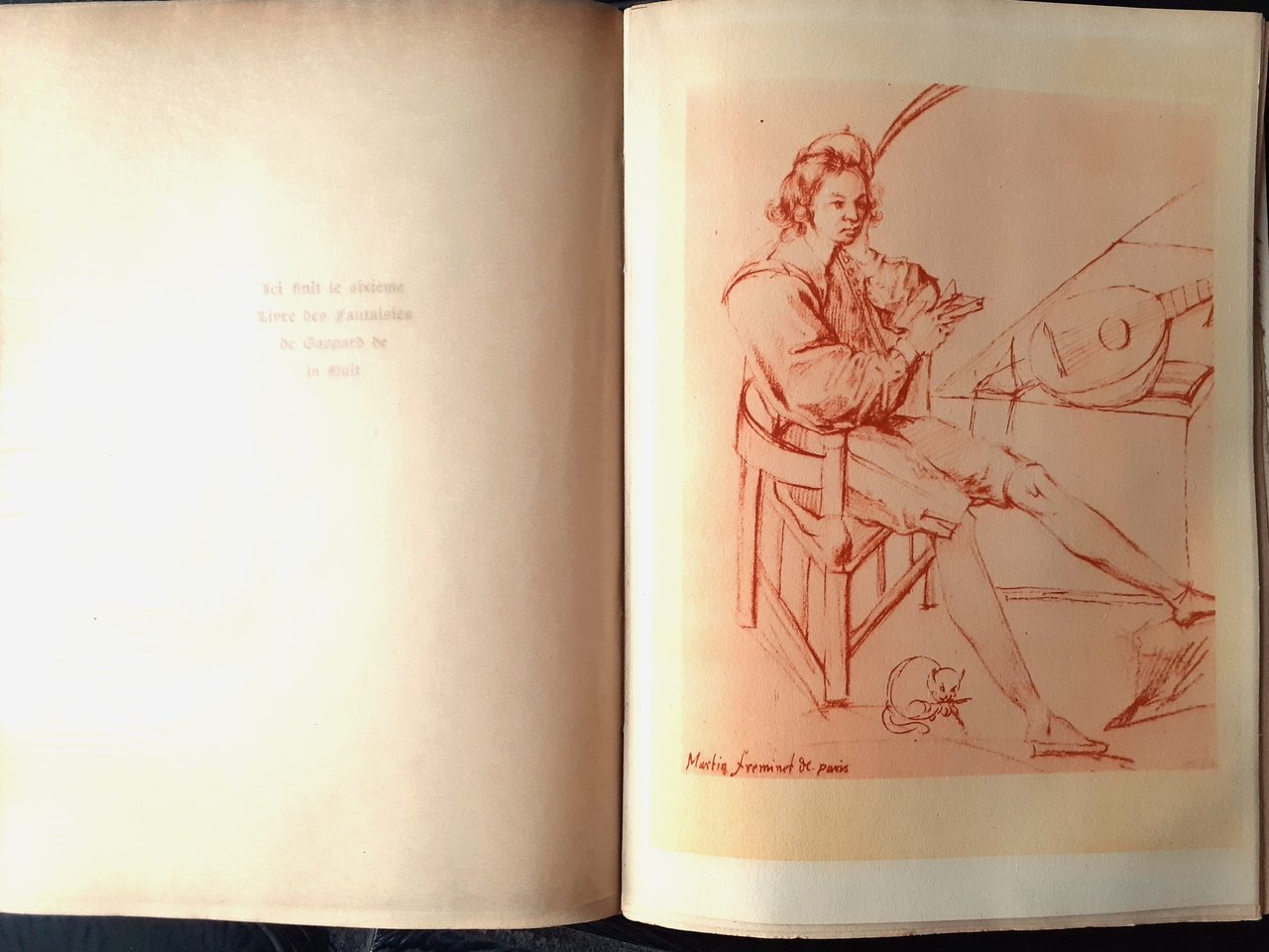 ed. 12 Juin 1943 (opera pubblicata per la prima volta postuma nel 1843), con tiratura limitata: "Le tirage comprend 500 exemplairews sur papier à la cuve, numérotés de 1 à 500 et 20 exemplaires hors commerce, numérotés de I à XX". Esemplare n. 495. Testo in francese. VIII/(4)+LXVIII+192/ brossura in cartoncino ruvido avorio, con risvolti e con titoli in nero e rosso e con ornati e marchio con motto in color rame. Con tavole a colori o in b/n f.t. protette da carta lucida semitrasparente (Goltius, H. "Étude" - Ostade (A. Van), "La danse dans la caverne" - Gravure tirée de Lull, R., "Liber de ascensu er descensu intellectus" - Dumonstier, D., "Portrait d'homme" - Troost, E., "Buveurs" - Goya, "Sorcières" - Freminet, M., Esquisse"). Con inoltre riproduzioni di scritti in color rame e cul-de-lampe figurati in color rame. Con fascetta editoriale in carta patinata ocra ("... Il usa sa jeunesse a ciseler en riche matière mille petites coupes d'une délicatesse infinie ..."). Stato buono (lieve usura della copertina - copertina lievemente brunita con piccole fioriture - quasi interamente intonso - pagine brunite). Table: Aloysius Bertrand; Notice par Sainte-Beuve (Charles Augustin de Sainte-Beuve, Juillet 1842) - Gaspard de la Nuit; Aloysius Bertrand - Préface; Gaspard de la Nuit - A M. Victor Hugo (Paris, 10 Septembre 1836) - Les Fantaisies de Gaspard de la Nuit (École flamande (Harlem - Le Maçon - L'Écolier de Leyde - La Barbe pointue - Le Marchand de tulipes - Les cinq Doigts de la main - La Viole de Gamba - L'Alchimiste - Départ pour le Sabbat) - Le vieux Paris (Le deux Juifs - Les Gueux de nuit - Le Falot - La Tour de Nesle - Le Raffiné - L'Office du soir - La Sérénade - Messire Jean - La Messe de Minuit - La Bibliophile) - La nuit et ses prestiges (La Chambre gothique - Scarbo - Le Fou - Le Nain - Le Clair de Lune - La Ronde sous la cloche - Un Rêve - Mon Bisaïeul - Ondine - La Salamandre - L'Heure du Sabbat) - Les chroniques (Maître Ogier (1407) - La Poterne du Louvre - Les Flamands - La Chasse (1412) - Les Reîtres - Les Grandes Compagnies (1364) - Les lépreux - A un Bibliophile) - Espagne et Italie (Le Cellule - Les Muletiers - Le Marquis d'Aroca - Henriquez - L'Alerte - Padre Pugnaccio - La Chanson du Masque) - Silves (Ma Chumière - Jean de Tilles - Octobre - Chèvremorte - Encore un Primtemps - Le deuxième Homme - A M. Sainte-Beuve) - Pièces détachées (Le bel Alcade - L'Ange et la Fée - La Pluie - Les deux Anges - Le Soir sur l'eau - Madame de Mntbazon - L'Air magique de Jehan de Vitteaux - La Nuit d'après une bataille - La Citadelle de Wolgast - Le Cheval mort - Le Gibet - Scarbo - A M. David, statuaire)).