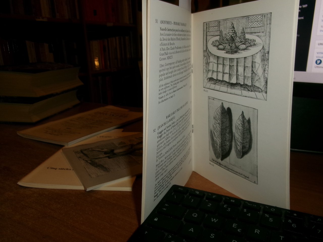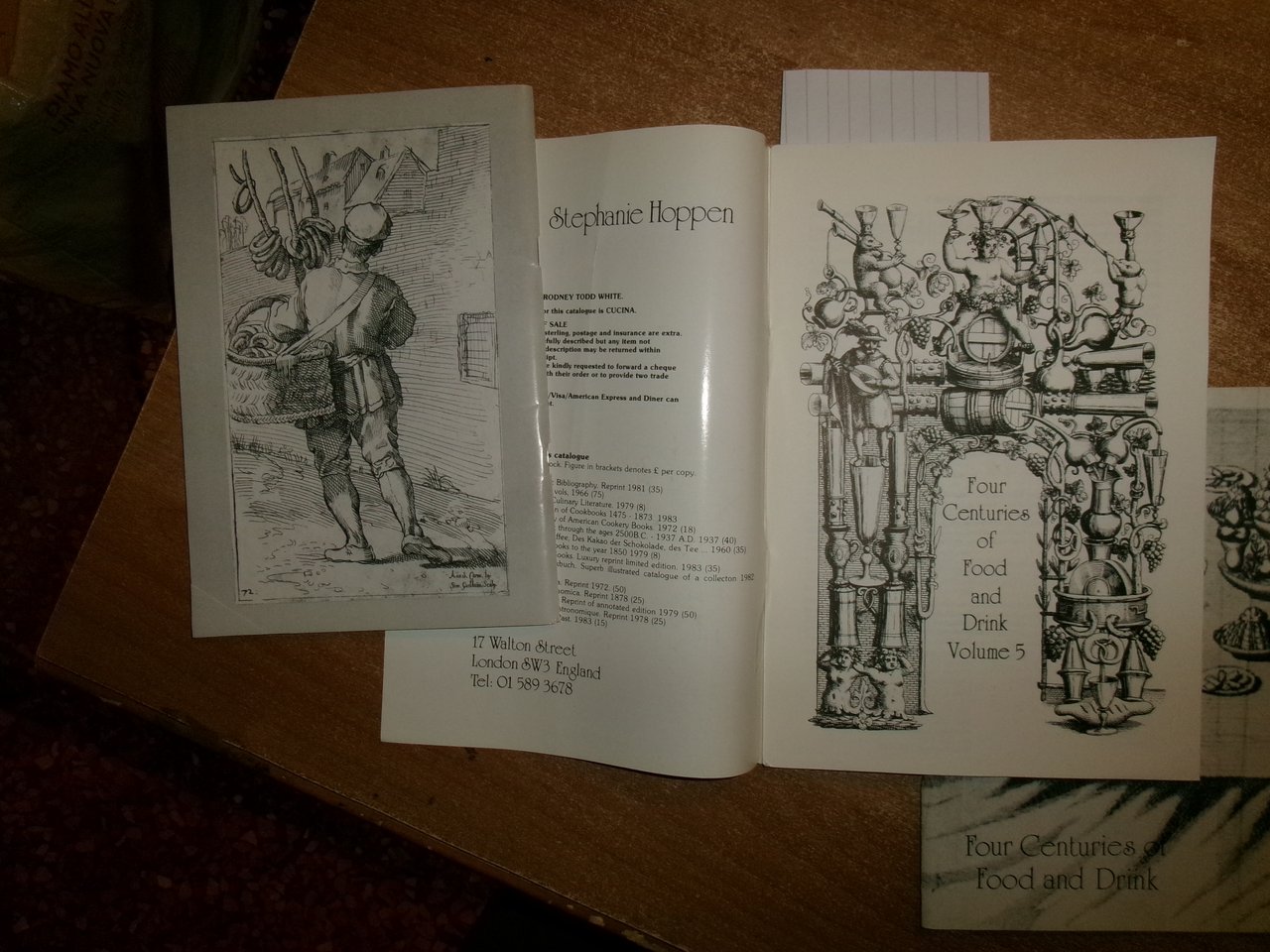 (Gastronomia) Stephanie Hoppen. Scripta Menent. London/Monaco. 4 cataloghi in-8°, br. con punti metallici. Four centuries of Food and Drink. Volume I - II 48, (2) pp.; 46 pp. con numerose riproduzioni n.t.; Four Centuries of Food and Drink volume 5. 66 pp. con riproduzioni n.t.; Cinq siècles d' art culinaire eb Europe. 79 pp. Tutti i cataloghi hanno i prezzi dei libri. Come nuovi. Neg. Mob. G entro busta trasp.
