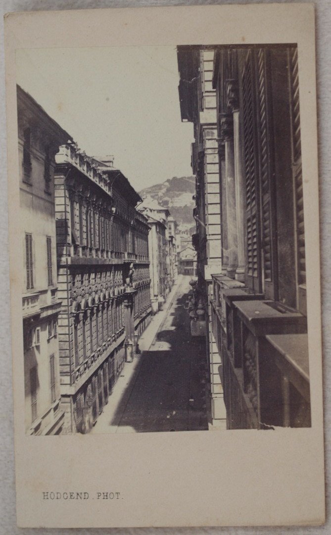 Foto originale all'albumina del 1870 circa che mostra via Balbi a Genova.<BR>Al verso timbro "Hodgend photographie" di Genova e nota manoscritta "Genes rue Balbi".<BR>La fotografia è applicata su cartoncino originale marchiato. Dimensioni cartoncino: mm 105x63. Dimensioni foto: mm 77x57. In ottime condizioni. Original albumine photo of 1870 circa showing via Balbi in Genova. In the verso mark "Hodgend photographie" in Genoa and handwritten note "Genes rue Balbi".<BR>The photo has been applied in an original marked carton paper. Size of page: mm 105x63. Size of the photo: mm 77x57. In very good conditions.
