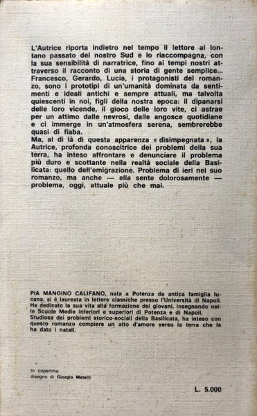 L'Autrice riporta indietro nel tempo il lettore al lontano passato del nostro Sud e lo riaccompagna, con la sua sensibilità di narratrice, fino ai tempi nostri attraverso il racconto di una storia di gente semplice. Francesco, Gerardo, Lucia, i protagonisti del romanzo, sono i prototipi di un'umiltà dominata da sentimenti e ideali antichi e sempre attuali, ma talvolta quiescenti in noi, figli della nostra epoca: il dipanarsi delle loro vicende, il gioco delle loro vite, ci astrae per un attimo dalle nevrosi, dalle angosce quotidiane, e ci immerge in un'atmosfera serena, sembrerebbe quasi di una fiaba. Ma, al di là di questa apparenza disimpegnata, la Autrice, profonda conoscitrice dei problemi della sua terra, ha inteso affrontare e denunciare il problema più duro e scottante nella realtà sociale della Basilicata: quello dell'emigrazione. Problema ieri nel suo romanzo, ma anche problema, oggi, attuale più che mai.