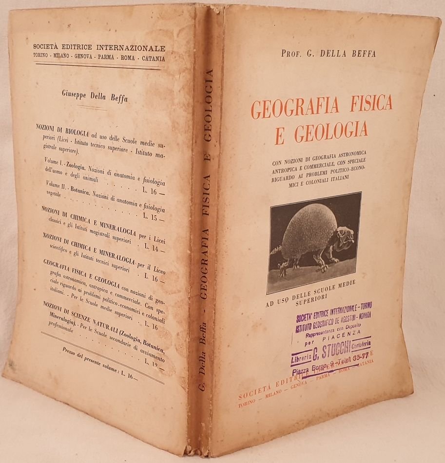 Edizione del 1934 di questo volume di geografia fisica e geologia scritto da Della Beffa ad uso delle scuole medie. Tra gli argomenti descritti: La sfera celeste, il sistema planetario, carte, geografia fisica e dinamica terrestre, atmosfera, clima, fenomeni vulcanici e sismici, fossili, rocce, stratigrafia e tetonica, geologia storica, geografia antropica e commerciale, possedimenti coloniali italiani ecc. All'interno foto e illustrazioni in bianco e nero. In ottime condizioni. Copertina editoriale in ottime condizioni generali con lievi usure ai margini e dorso. Legatura in buone condizioni. Pagine in ottime condizioni con rare fioriture, ancora da tagliare. In 8. Dim. 23x15,5 cm. Pp. 312. Edition of 1934 of this volume of physical geography and geology written by Della Beffa for the usage of the Institute. Inside black and white photoes and illustrations. In very good condition Editorial cover in very good general conditions slightly worn in the edges and spine. Binding in good conditions. Pages are in very good conditions with occasional foxings, syill uncut. In 8. Dim. 23x15,5 cm. Pp. 312.