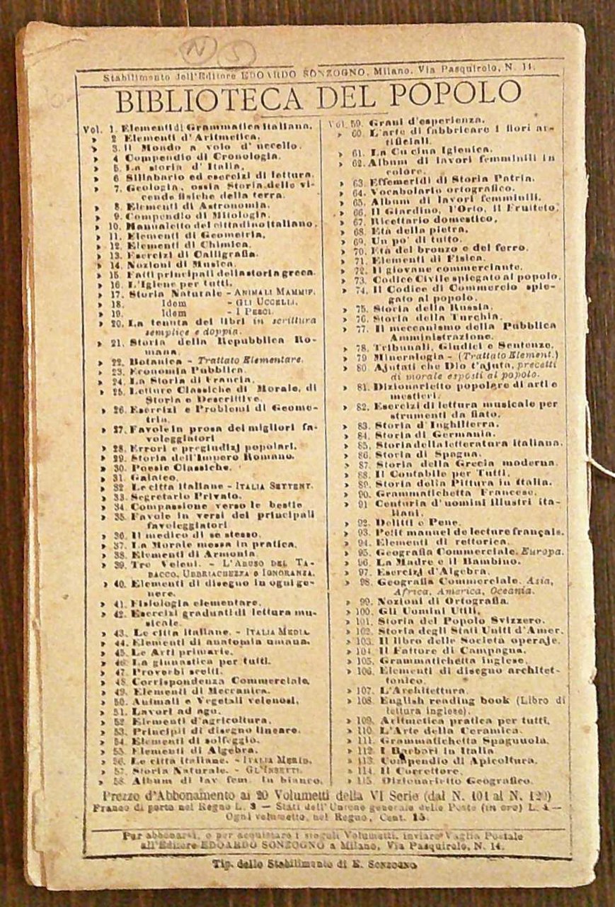 Geologia ossia Storia delle vicende fisiche della Terra. Biblioteca del Popolo N.7. Propaganda d'Istruzione. Ed. Edoardo Sonzogno - Milano, 1881. Brossura editoriale con lieve segno di matita colorata al piatto e mancanza alla metà inferiore del dorso. 11x16; pp.63. Buonissimo stato. , Molto buono (Very Good)