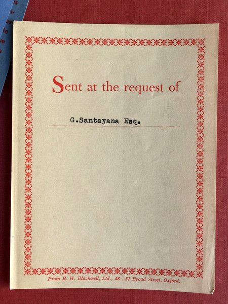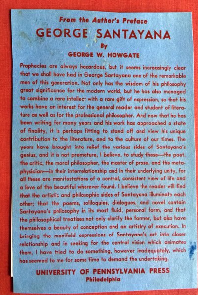 Soggetti: Filosofia, Scritti, Opere generali, Philosophy, A Philosophical Novelist, Last Puritan, Santayana's letters, Daniel Cory, Bernard Berenson, Robert Seymour Bridges, Curt John Ducasse, John Erskine, Horace Meyer Kaller, Lewis Mumford, George Herbert Palmer, John Francis Stanley Russell, Herbert Wallace Schneider, Charles Augustus Strong, Paul Weiss, and Harry Austryn Wolfson, Wendell T. Bush, Alys Gregory, Marianne Moore, John Middleton Murray, Frederick J. E. Woodbridge, essays, Spanish–American philosophers, materialism, naturalistic ethics, aesthetics, Morale, Etica, Estetica, Pensiero, Materialismo, Cosmopolitanism, Epicurean, Rome, Giuseppe Patella, Skowroński, Soliloquies, theory, Stoicismo, Puritanesimo, John Dewey, John Lachs, John McCormick, Epicurus, Peirce, realm of truth, Robert Lowell, Wallace Stevens, George Sturgis, Charles Augustus Strong, Logan Pearsall Smith, Marianne Moore, Works, Bertrand Russell, The Life of Reason, Reason in Common Sense, The Sense of Beauty, The Idea of Christ in the Gospels, Realms of Being, Sfere dell'essere, L'ultimo puritano, L'idea di Cristo nei Vangeli, Il senso della bellezza, Harvard University, Idealismo, Poetry, Poetica, Naturalismo, Ontologia, Coscienza, Winds of doctrine, Character and opinion in the United States, Interpretation of poetry and religion, Modern world, Thinking, Critics, America, Early years, Italy, Roma, Methaphysician, Notes, Bibliography, Ex-Library, Ex-libris, Bibliografia, Literature, Pensiero americano, Biografia, Soliloqui, Libri rari, Vintage, First editions, Collezionismo, Libri antichi