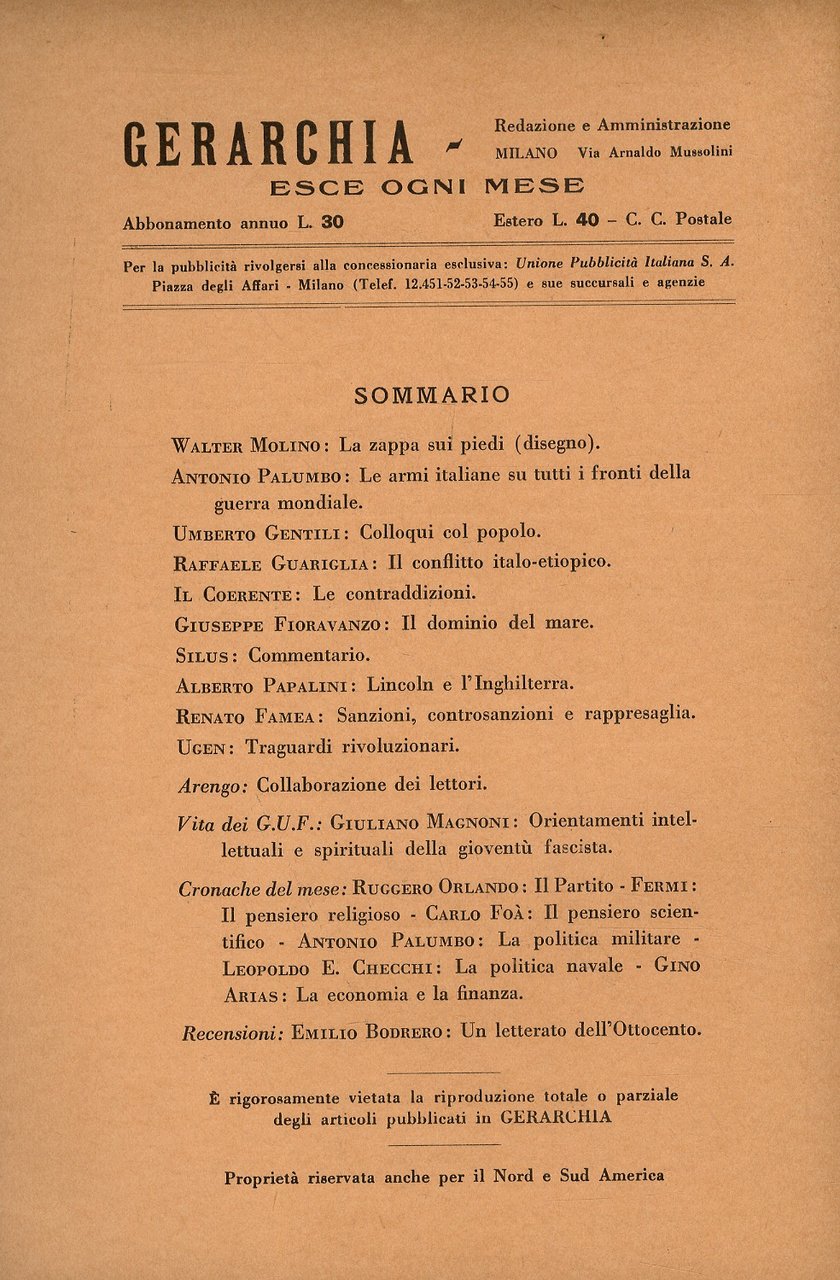 GERARCHIA. Rassegna mensile della rivoluzione fascista. fondatore: Benito Mussolini. Anno XVI. 1936; numero 2, febbraio 1936.