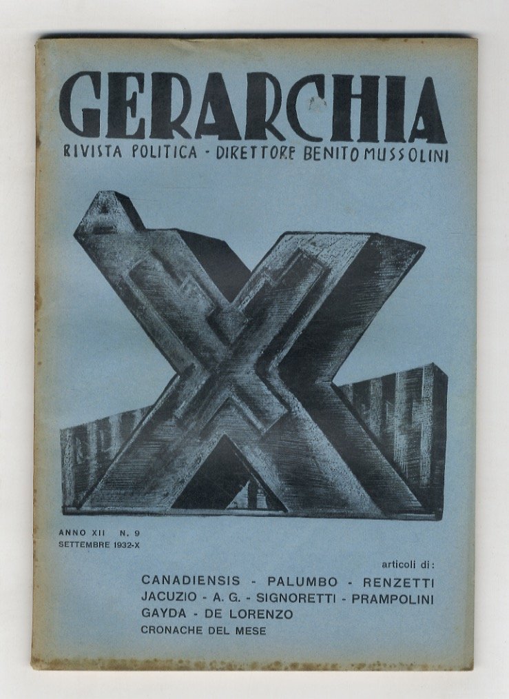 GERARCHIA. Rivista politica. Direttore: Benito Mussolini. Anno XII. 1932; di quest'annata disponiamo dei fascicoli mensili: 7-8, 9, 10, 12.