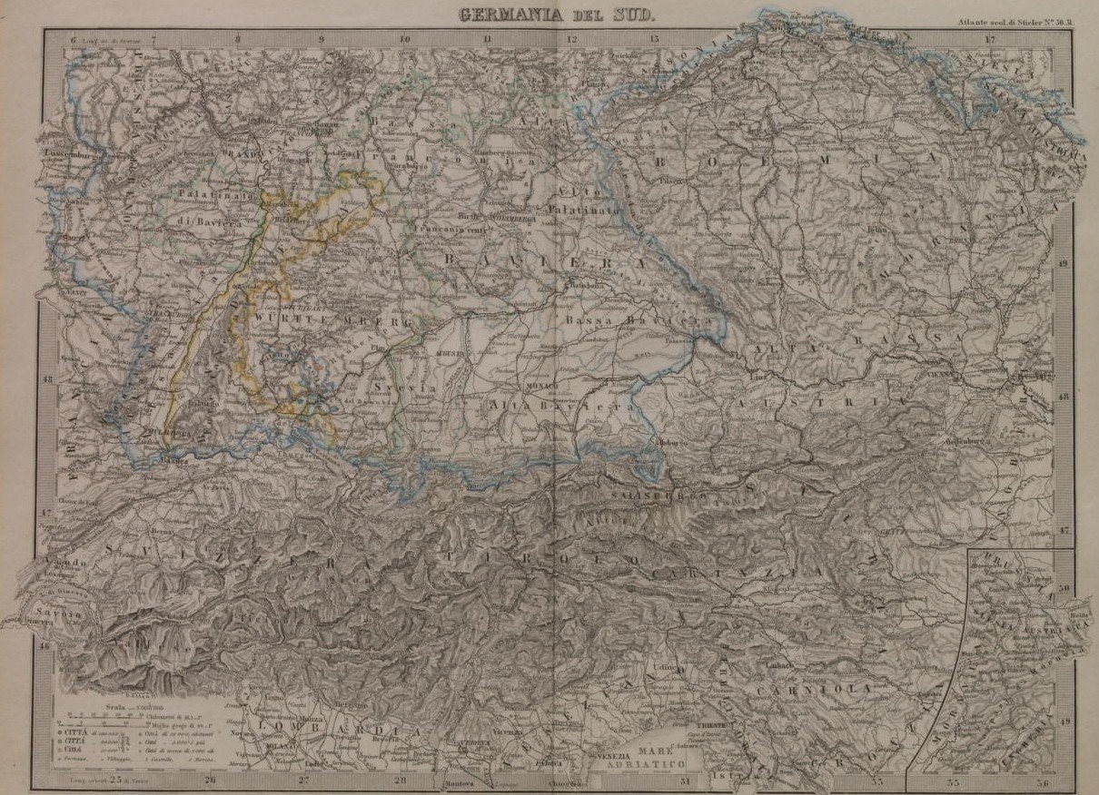 Bella incisione su rame colorata del 1880 tratta dall'opera "Atlante scolastico per la geografia politica e fisica di Ad. Stieler ed Erm. Berghaus". L'incisione rappresenta la Germania del Sud: Baviera, Tirolo, Svevia, Svizzera, Boemia. INCISIONE: Incisione su rame DIMENSIONI FOGLIO: cm 31,5x24,5 DIMENSIONI INCISIONE: cm 24x19 EPOCA: 1880 CONDIZIONI: Ottime. Piegatura verticale. Very beautiful copper engraving of 1880 taken from the historical work "Atlante scolastico per la geografia politica e fisica di Ad. Stieler ed Erm. Berghaus". View of South Germany: Baviera, Tirolo, Svevia, Switzerland, Boemia. ENGRAVING: copper plate LEAF DIMENSION: 31,5x24,5 ENGRAVING DIMENSION: cm 24x19 DATE: 1880 CONDITIONS: Very good conditions. Vertical folding.
