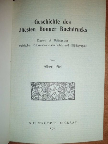 Zugleich ein Beitrag zur rheinischen Reformations - Geschicte und - Bibliographie. Von Albert, Piel. Nieuwkoop / B. De Graaf, 1965. In - 8°, tela con tassello e titolo in oro (legatura nuova), copertine originali conservate. 113 pp. con 12 fac - simili in tavole f.t. Esemplare come nuovo.