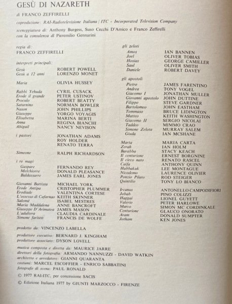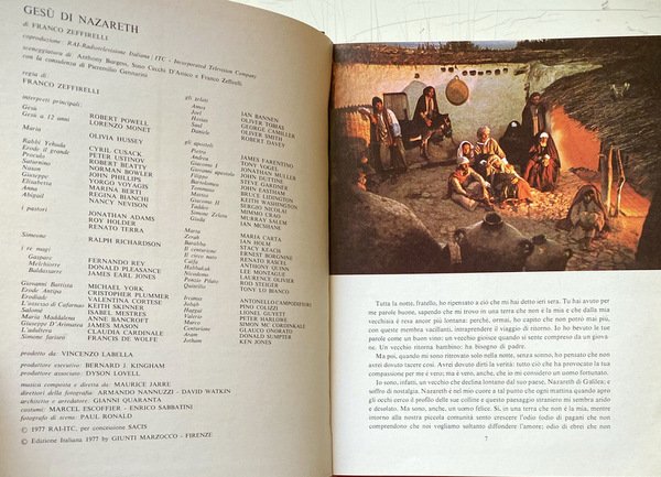 Soggetti: Cinematografia, Libri illustrati di film, Scandali cinematografici, Gesù di Nazareth, Biografie, Franco Zeffirelli, Anni Settanta, Cinema italiano, Soggetti storico-religiosi, Robert Powell, Olivia Hussey, Sceneggiati televisivi, Miniserie, Serie TV, Vita di Cristo, Immagini, Romanzo, Cast, Sceneggiatura, Anthony Burgess, Suso Cecchi D'Amico, Ambientazione storica, Bibbia, Antica Roma, San Giovanni Battista, Cultura di massa, Serie bibliche, Man of Nazareth, A Spiritual Diary, William Barclay, Critica, Aldo Grasso, Saghe storiche, Ritratti, Successi mondiali, Migliori film, Parabola del figliuol prodigo, Impero romano, Giuda, Barabba, Ponzio Pilato, Re Magi, Infanzia, Erode, Ebrei, Palestina, Israele, Gerusalemme, Terra Santa, Sinai, Miracoli, Vangeli, Emmy Award, San Pietro, Armando Nannuzzi, Fotografia, Attori, Costumi, Film in costume, Nastro d'argento, Scenografia, Gianni Quaranta, Armando Nannuzzi, Variazioni narrative, Fonti evangeliche, Tradizioni extra-bibliche, Apostoli, Discepoli, Zeloti, Zerah, Sinedrio, Tempio, Getsemani, Quintilio, Yehuda, Amos, Bar mitzvah, Prostituta, Maria Maddalena, Maria di Betania, Lazzaro, Giovanni, Nicodemo, Simone, Tommaso, Giairo, Morti, Matteo, Vangelo, Tradimento, Processo, Condanna, Crocifissione, Erode Antipa, Luca, Centurioni romani, che Guarigioni, Schiavi, Ernest Borgnine, Soldati, Croce, Giuseppe, Corona di spine, Cieco nato, Giudea, Augusto, Imperatore, Dio, Messia, Zaccaria, Betlemme, Giordano, Battesimo, Fuga, Egitto, Sacre Scritture, Discorso della montagna, Matteo Levi, Erodiade, Salomè, Ultima Cena, Caifa, Golgota, Masolino D'Amico, David Butler, Pier Emilio Gennarini, Format televisivo, Megaproduzioni, Kolossal, Mitologia, Anne Bancroft, Ernest Borgnine, Laurence Olivier, Anthony Quinn, Rod Steiger, Peter Ustinov, Oscar, Ian Bannen, Valentina Cortese, Ian Holm, James Earl Jones, James Mason, Ralph Richardson, Christopher Plummer, Riprese, Hollywood, Olivia Hussey, Michael York, Roy Holder, Dyson Lovell, Keith Skinner, Pino Colizzi, Profezie, Pasqua, Via Crucis, Arte devozionale, Papa Paolo VI, Episodi, Trama, Regno Unito, The New York Times, Share, Ratings, Spettatori, Pubblico, Controversie, Libri Vintage fuori catalogo, Collezionismo, Da collezione, Riferimento, Filmografia, Rai, Bartolino Bartolini, Cinematography, Illustrated film books, Movie scandals, Jesus, Biographies, The 70s, Italian cinema, Historical-religious subjects, TV dramas, Miniseries, Series, Life of Christ, Images, Novel, Screenplay, History, Bible, Ancient Rome, St. John the Baptist, Mass culture, Biblical series, Criticism, Historical sagas, Portraits, Worldwide Blockbuster, Best films, Parable of the prodigal son, Roman empire, Judas, Barabbas, Pontius Pilate, Childhood, Herod, Jews, Palestine, Jerusalem, Holy Land, Miracles, Gospels, St. Peter's, Photography, Actors, Costumes, Period film, Silver ribbon, Scenography, Narrative variations, Gospel sources, Non-biblical traditions, Apostles, Disciples, Zealots, Sanhedrin, Temple, Gethsemane, Quintilius, Prostitute, Mary Magdalene, Bethany, Lazarus, John, Nicodemus, Simon, Thomas, Jairus, Dead, Matthew, Gospel, Betrayal, Trial, Condemnation, Crucifixion, Herod, Luke, Roman Centurions, Healing, Slaves, Soldiers, Cross, Joseph, Crown of Thorns, Born Blind, Judea, Augustus, Emperor, God, Messiah, Zechariah, Bethlehem, Jordan, Baptism, Escape, Egypt, Holy Scriptures, Sermon on the Mount, Herodias, Last Supper, Caiaphas, Golgotha, Megaproductions, Mythology, Prophecies, Easter, Devotional art, Pope Paul VI, Episodes, Plots, United Kingdom, Viewers, Audience, Controversies, Out of print books, Collectables, Collectables, Reference, Filmography