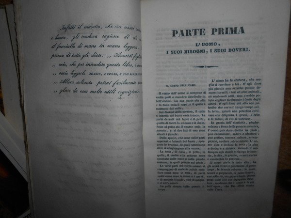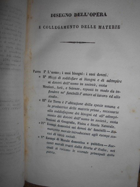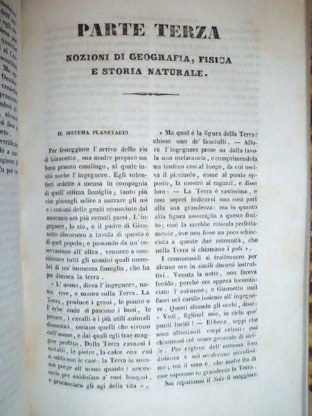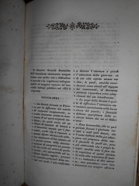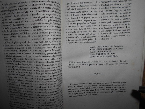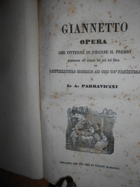 Opera che ottenne in Firenze il premio promesso all' autore del più bel libro di letteratura morale ad uso de' fanciulli. In - 8°, m. pergamena coeva. 386, (2) pp. con vignetta familiare nel frontespizio. Testo stampato su due colonne. Lievi insignificanti rifioriture nella prima e nell' ultima carta, ma bell' esemplare. Edizione originale rarissima non citata dai bibliografi, che ritengono prima quella del 1837. Cfr. Dizionario enciclopedico della letteratura italiana, IV, pp. 266 - 67: <<. Gli diede maggiore fama. Giannetto. Letture pe' fanciulli e pel popolo (Como, 1837), con cui vinse un concorso bandito nel 1836 a Firenze. Il libro ebbe molta fortuna e fu, prima di Cuore di E. De Amicis, il testo più diffuso di letteratura per l' infanzia.>>. (Libri per l' infanzia). Neg. mob. 6