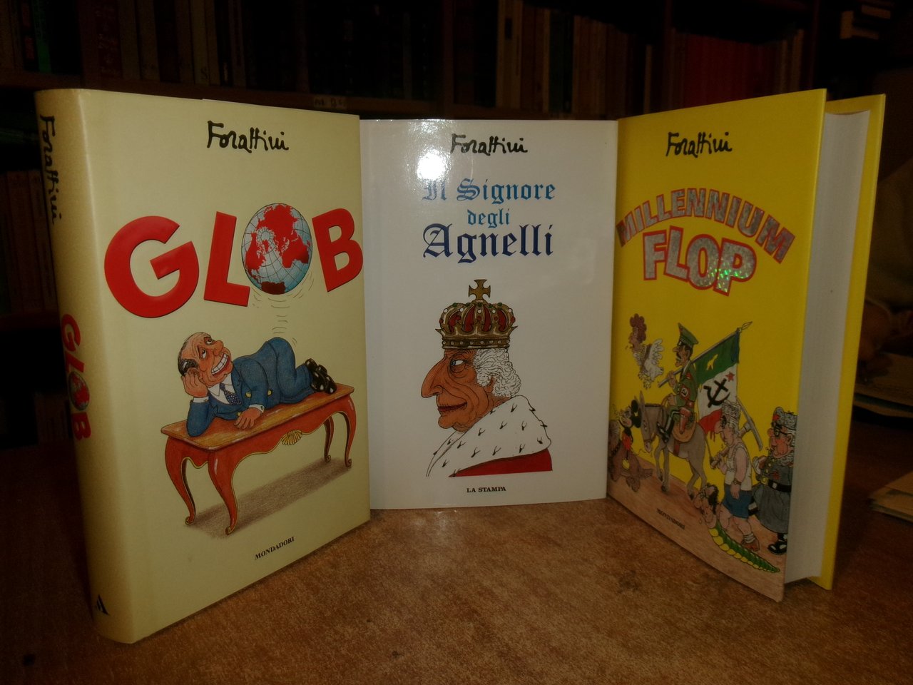 GIORGIO FORATTINI. 3 volumi: Il Signore degli Agnelli/Glob/Millennium Flop. Milano, Mondadori, 2004 - 2001 - 1999. 3 volumi in-8°, cartonato edit. con sovracopertine ill. a col. 161 pp.; 382 pp.; 350 pp. Neg. alto sopra 16 in pluri...