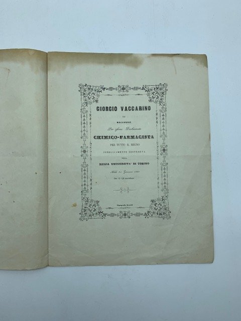 Giorgio Vaccarino da Racconigi per essere dichiarato chimico-farmacista.per tutto il regno pubblicamente sosteneva nella Regia Universita' di Torino | Libri antichi e moderni | Giorgio Vaccarino