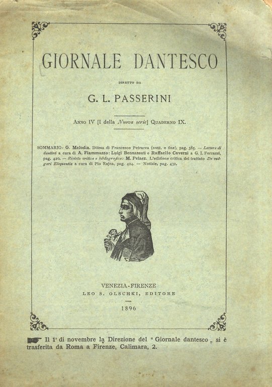 GIORNALE dantesco. Diretto da G.L. Passerini. Anno IV (I della Nuova serie). 1896. Quaderno IX.