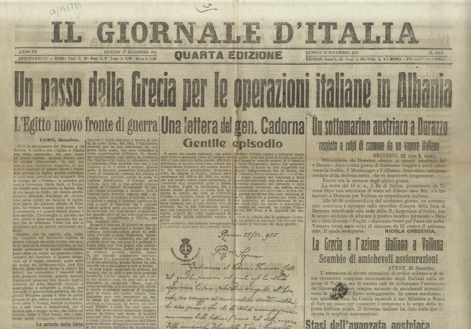 GIORNALE (IL) d'Italia. Quarta edizione. Anno XV. Lunedì 27 dicembre 1915.