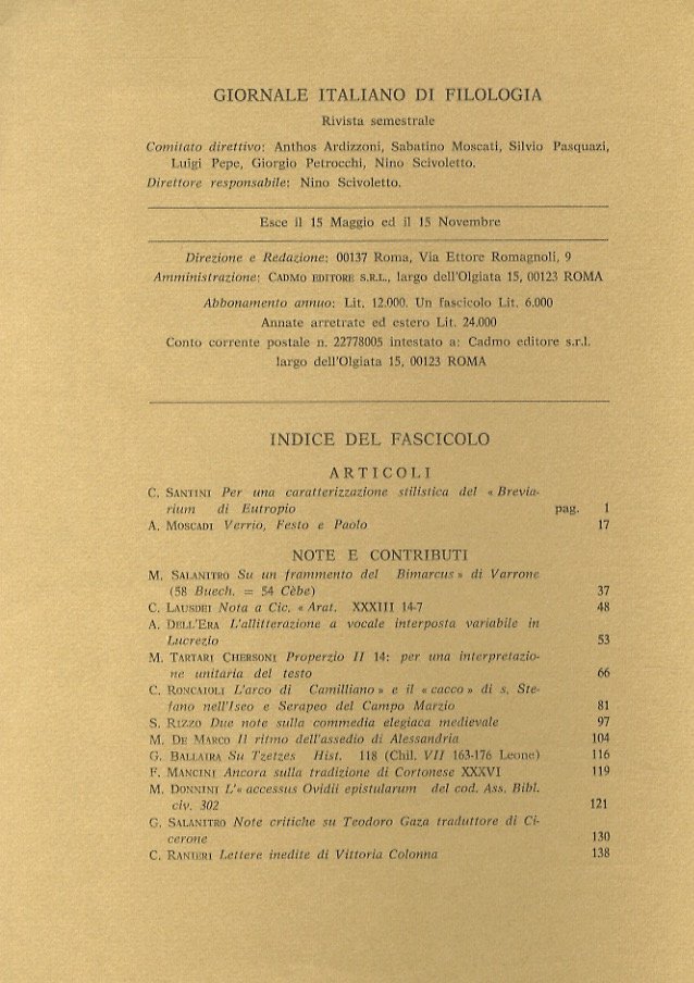 Giornale italiano di Filologia. Rivista semestrale. 15 Maggio 1979. (Segnaliamo di: RANIERI C., Lettere inedite di Vittoria Colonna - RONCAIOLI C. L'arco di Cammilliano" e il "cacco" di S. Stefano nell'Iseo e Serapeo di Campo Marzio - DELLERA A., L'allitterazione a vocale interposta variabile in Lucrezio, ecc.).