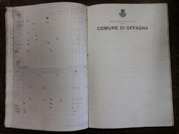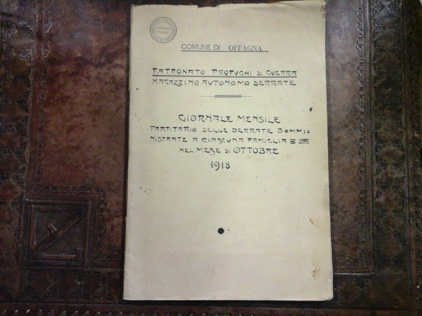 PEZZO UNICO. Bellissimo e prezioso registro manoscritto che tiene nota delle derrate alimentari (voci quali: farina di grano, pane, lardo, olio, ecc.) distribuite ai profughi di guerra nel mese di ottobre del 1918. In c.ca 80 pp con stemmi del comune di Offagna.
