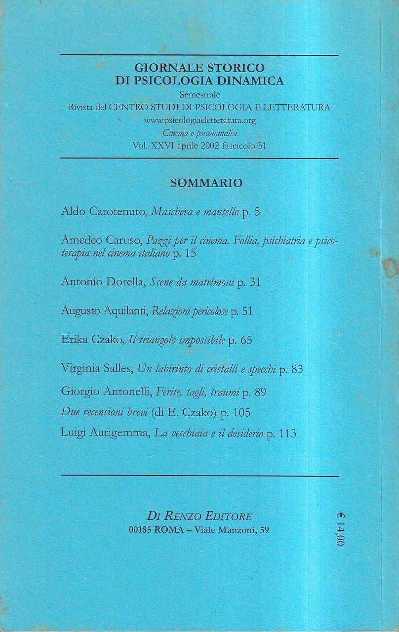 Rivista del Centro Studi di Psicologia e Letteratura - Brossura editoriale di 127 pagine. Una dedica in apertura, peraltro ottima copia - SOMMARIO: Aldo Carotenuto, "Maschera e mantello" - Amedeo Caruso, "Pazzi per il cinema. Follia, psichiatria e psicoterapia nel cinema italiano" - Antonio Dorella, "Scene da matrimoni" - Augusto Aquilanti, "Relazioni pericolose" - Erika Czako, "Il triangolo impossibile" - Virginia Salles, "Un labirinto di cristalli e specchi" - Giorgio Antonelli, "Ferite, tagli, traumi" - Due recensioni brevi (di E. Czako) - Luigi Aurigemma, "La vecchiaia e il desiderio"