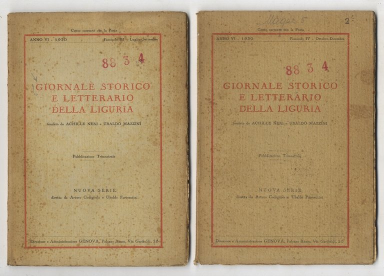 GIORNALE storico e letterario della Liguria. Fondato da Achille Neri e Ubaldo Mazzini. Pubblicazione trimestrale. Nuova serie, diretta da Arturo Codignola e Ubaldo Formentini. Anno VI - 1930: Fascicolo III, luglio-settembre e fascicolo IV, ottobre-dicembre.