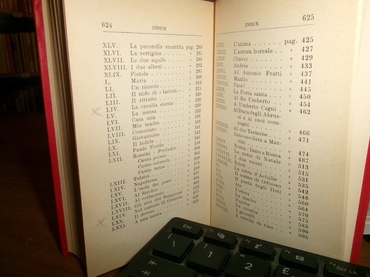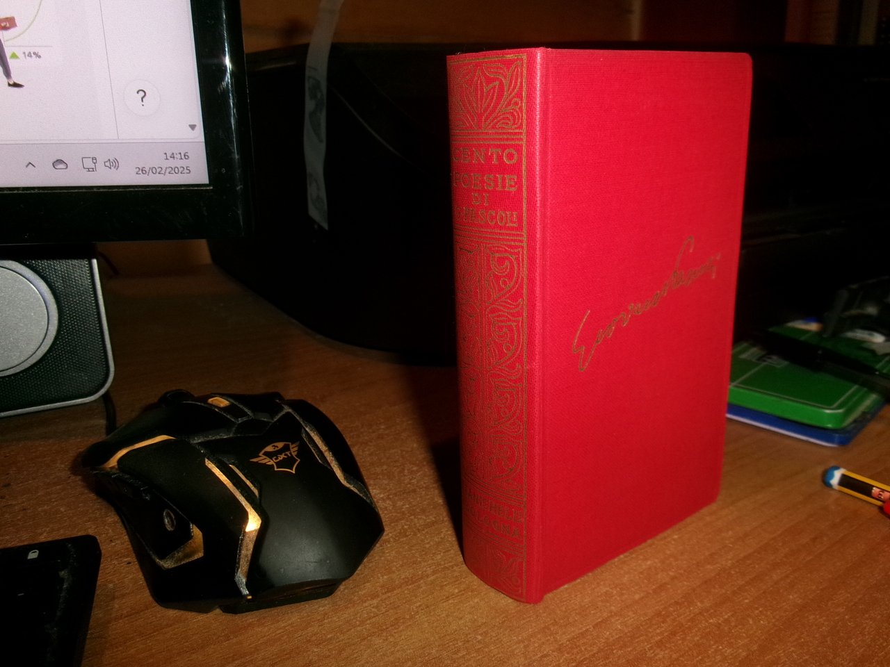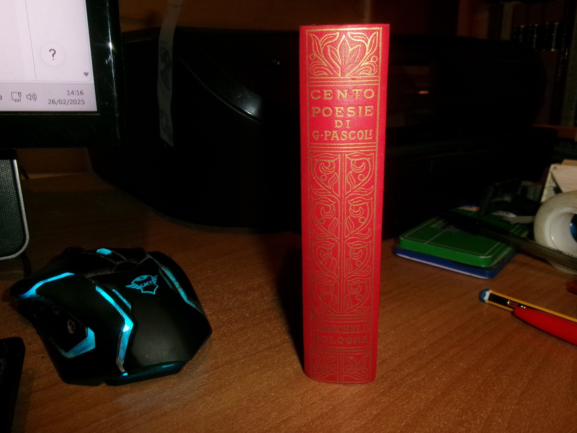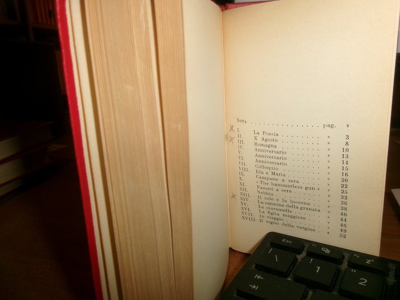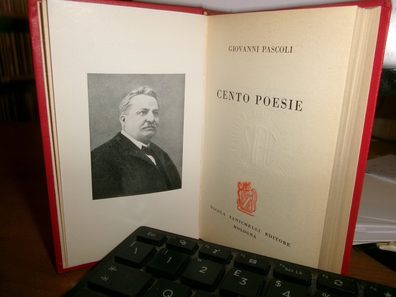 GIOVANNI PASCOLI. CENTO POESIE - Bologna, Zanichelli, 1963. In-16° piccolo, tela rossa edit. con fregi e titoli in oro. vii, 626 pp. con ritratto in antiporta. Ottimo stato con dedica e firma di ex proprietà. Neg. scat. ultimi Hoepli.