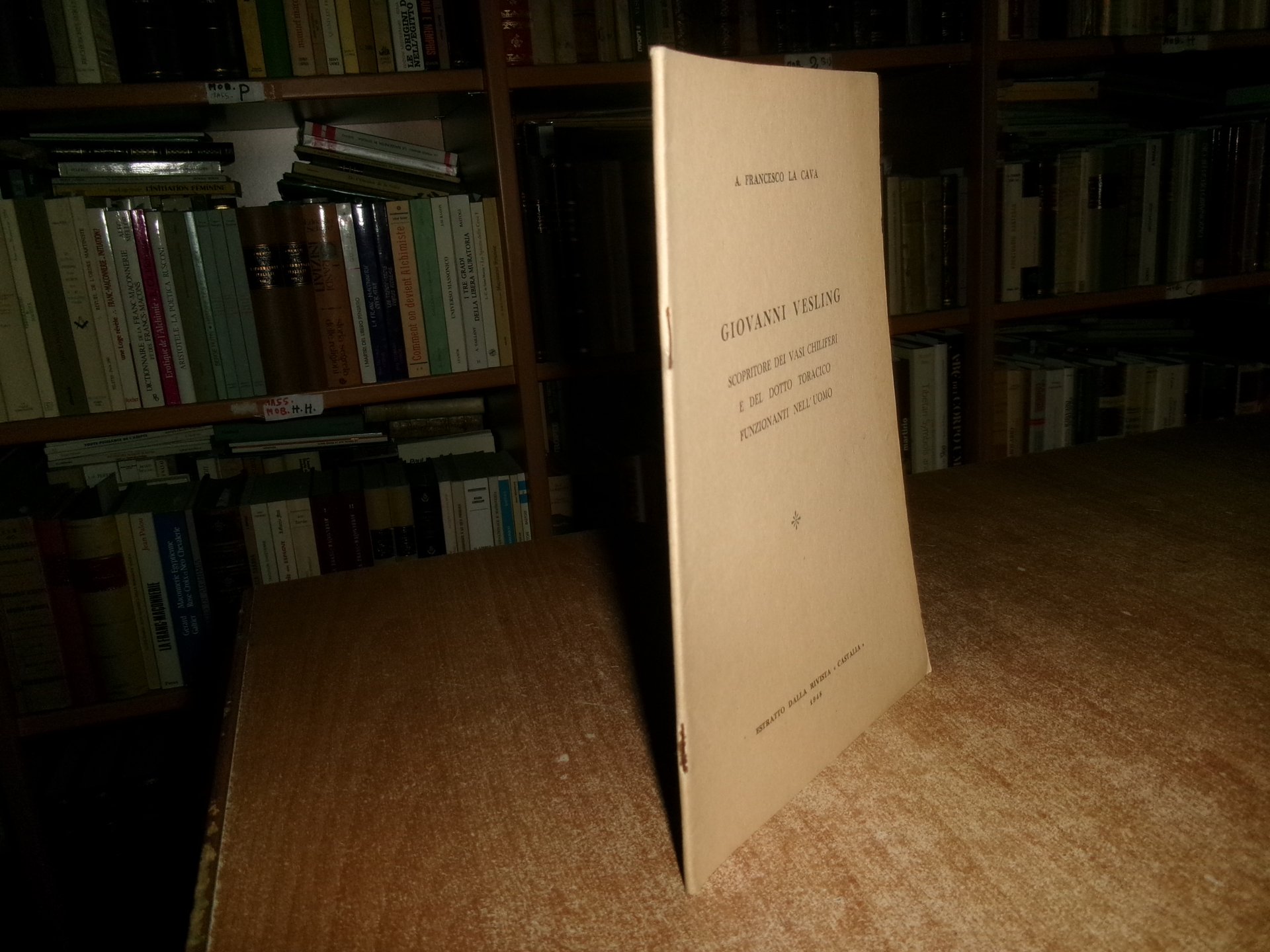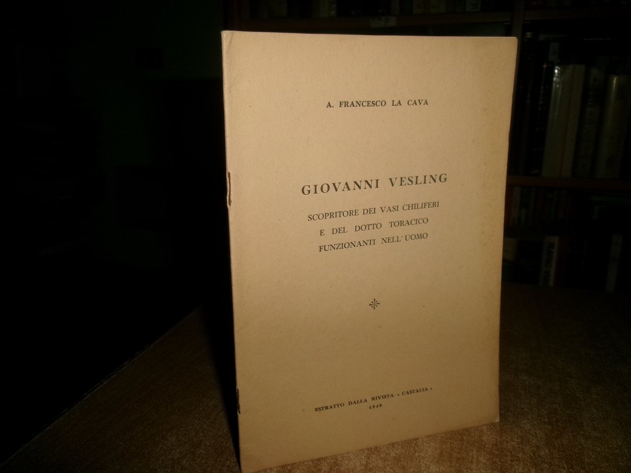 FRANCESCO LA CAVA. Estratto dalla Rivista << Castalia>>, 1948. GIOVANNI VESLING scopritore dei vasi chiliferi e del dotto toracico funzionanti nell' uomo. In-8°, br. orig. con punti metallici. 23 pp. con due figure applicate negli appositi spazi. Opuscolo in ottimo stato. Uff. C - I - 1 - 2