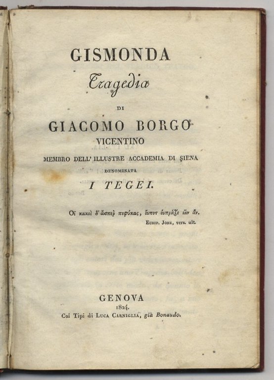 Gismonda. Tragedia di Giacomo Borgo vicentino, membro dell'Illustre Accademia di Siena denominata I Tegei.