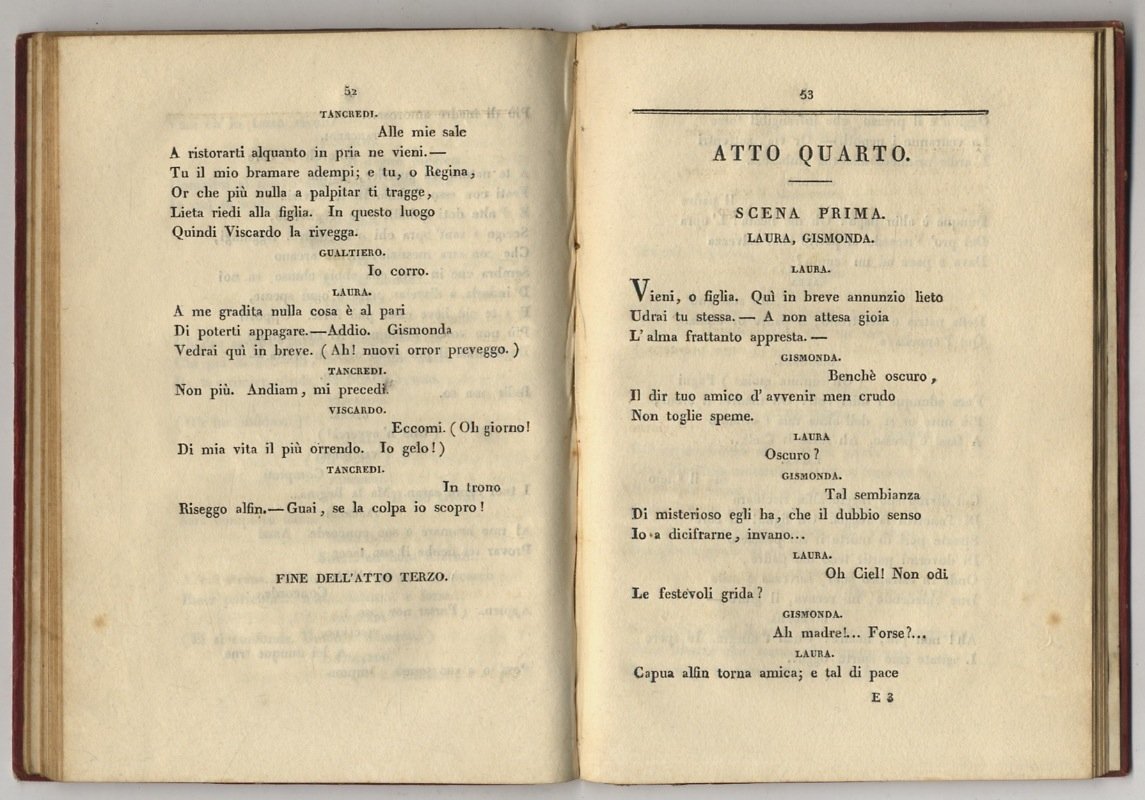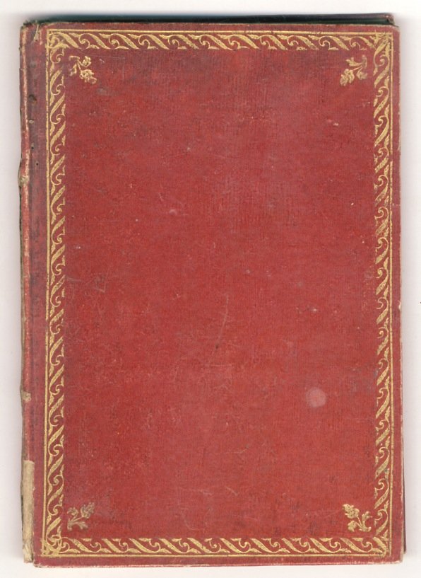 Genova, coi tipi di Luca Carniglia, già Bonaudo, 1824, in-8, elegante legatura coeva in cartone rosso che imita la pelle, cornici ed angolari fitomorfi oro ai piatti, sguardie marmorizzate, tagli dorati, pp. 78, (2). Note manoscritte (datate 1867) al verso della carta bianca finale. Mancanze al dorso; macchie al verso del foglio di guardia anteriore, ma interno in ottime condizioni. Edizione originale.