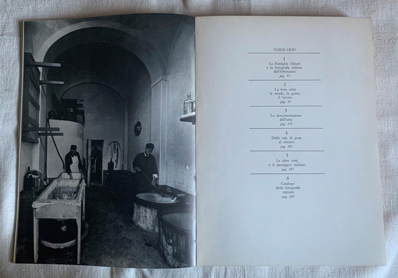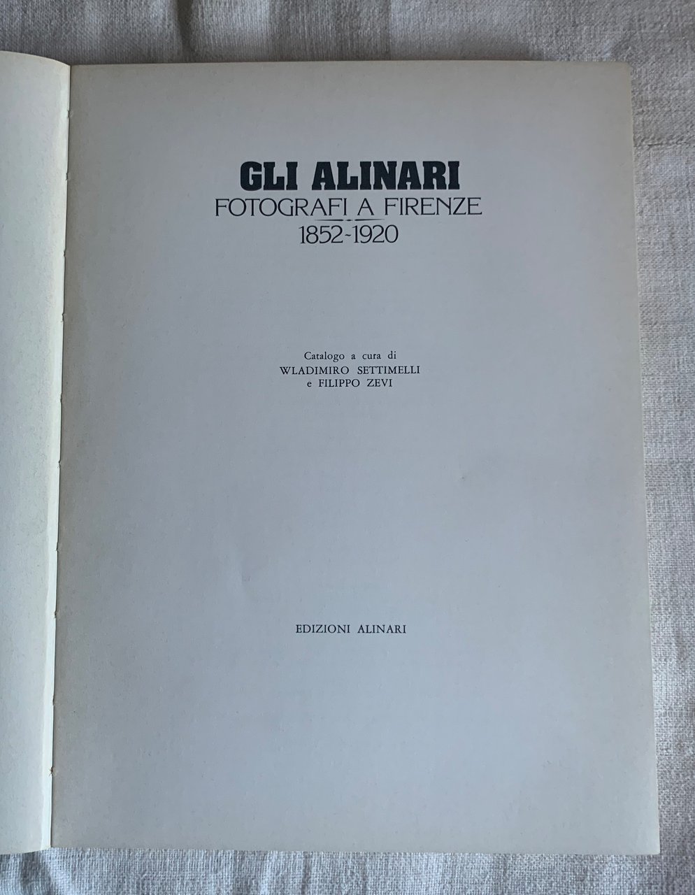 I ed.. Catalogo della mostra tenutasi presso il Forte di Belvedere di Firenze nel luglio-ottobre 1977. VIII grande/ 320/ brossura in cartoncino argento con ampi risvolti illustrata con fotografia in b/n (Ragazza in poltrona. La Signora Novaro, 1865. Lastra al collodio 13x18 n. 33851). Con 774 riproduzioni fotografiche in b/n più qualche altra immagine, sempre in b/n. Grafica di Leonardo Mattioli. Stato buono (leggero stato d'uso della copertina). Sommario: Presentazione; dei Fratelli Alinari-Istituto di Edizioni Artistiche - Presentazione; di Franco Camarlinghi (Assessore alla Cultura del Comune di Firenze) - Presentazione; di Wladimiro Settimelli - La Famiglia Alinari e la fotografia italiana dell'Ottocento; a cura di Wladimiro Settimelli - La loro città: le strade, la gente, il lavoro; a cura di Arnaldo Salvestrini, Fernando Tempesti, Luigi Tomassini, Lorenza Trionfi Honorati. Testo di Arnaldo Salvestrini (testo estratto dalla pubblicazione "Florence.Some notes on history and town planning"/ "Firenze. Note di Storia e Urbanistica" predisposta dal Comune di Firenze in occasione della mostra storica per immagini in corso di presentazione in U.S.A., in U.R.S.S. e nelle città d'Europa e del mondo) - La documentazione dell'arte; a cura di Massimo Ferretti, Alessandro Conti, Ettore Spalletti - Dalla sala di posa al ritratto; a cura di Arnaldo Salvestrini, Fernando Tempesti, Luigi Tomassini, Lorenza Trionfi Honorati. Testo di Fernando Tempesti - Le altre città e il paesaggio italiano; a cura di Filippo Zevi - Catalogo delle fotografie esposte.