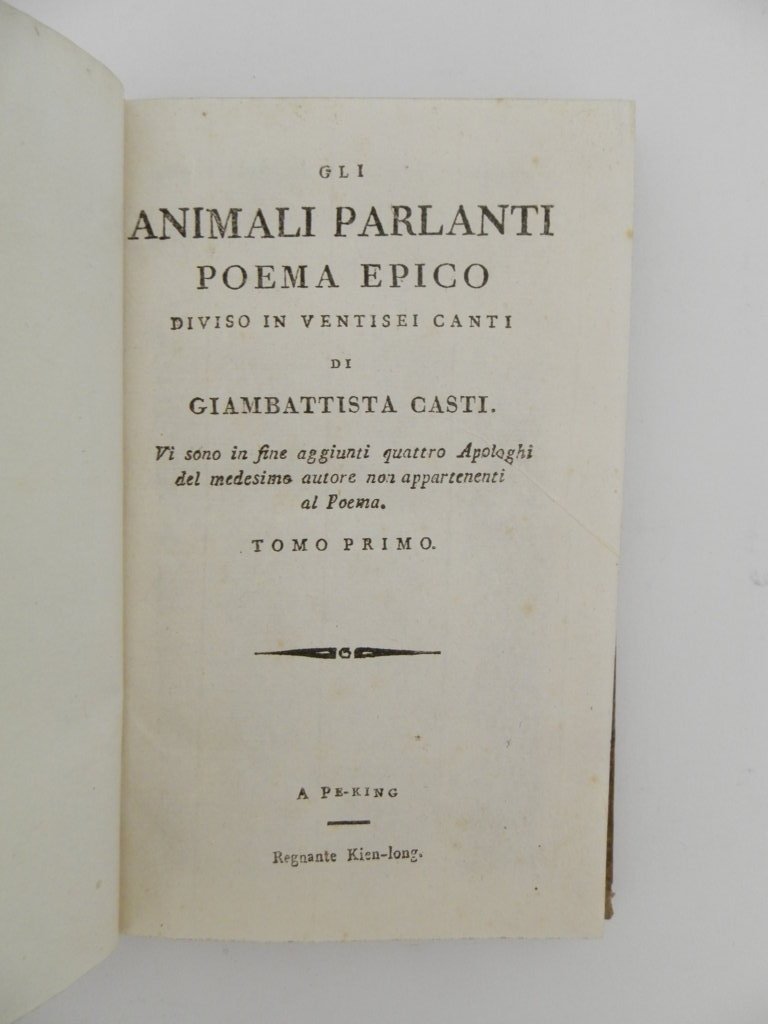 Gli animali parlanti poema epico diviso in ventisei canti di Giambattista Casti. Vi sono in fine aggiunti quattro Apologhi del medesimo autore non appartenenti al poema