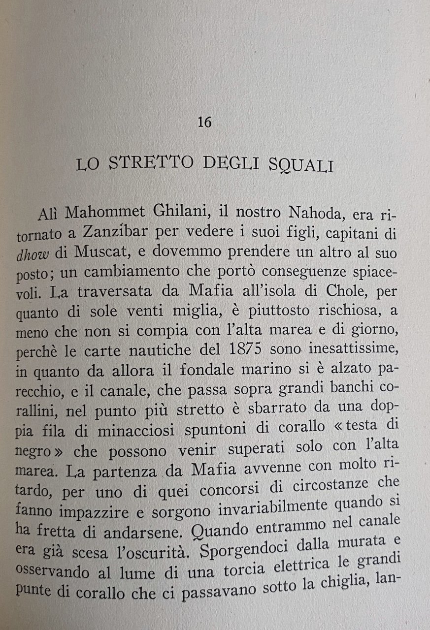 Voglio qui esprimere i miei più profondi ringraziamenti l'incoraggiamento e in certi casi per il preziosissimo aiuto che ho ricevuto durante la mia spedizione; al Sultano di Zanzibar, a Jack Sinclair, al comandante Milner, a Ernest Rodwell del Mombasa Times, a H.V. Austin e al capitano Bill Byles, della Union Castle Line, a Dimitri Lupis, a Arnald Klosser dell'Inkosana e al maggiore Grundy dell'Huria. Devo ringraziare in maniera particolare il mio segretario Corneille Benoist per la meravigliosa abilità con la quale ha decifrato un manoscritto costellato di macchie di tè, di cera e di acqua salata. Per ultimo levo il mio bicchiere al coraggioso vecchio che nel seno della sua antica razza attende ora la chiamata di Allah: a Ali Mahommet Ghilani, gentiluomo e capitano di dhow.