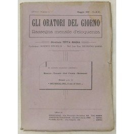 Gli oratori del giorno. Rassegna mensile d'eloquenza. Anno I, Numero 1. Maggio 1927. Presentazione di Titta Madia - Il Guardasigilli parla alla Camera dei problemi della Giustizia (con note di M. Maravigna); L'orazione di Carlo Del Croix a Pisa sul Popolo rinato e risorto; Conferenze d'attualità. Enrico Ferri - Mussolini uomo di Stato; Il nuovo Stato Corporativo nel pensiero e nella parola di E. Rossoni