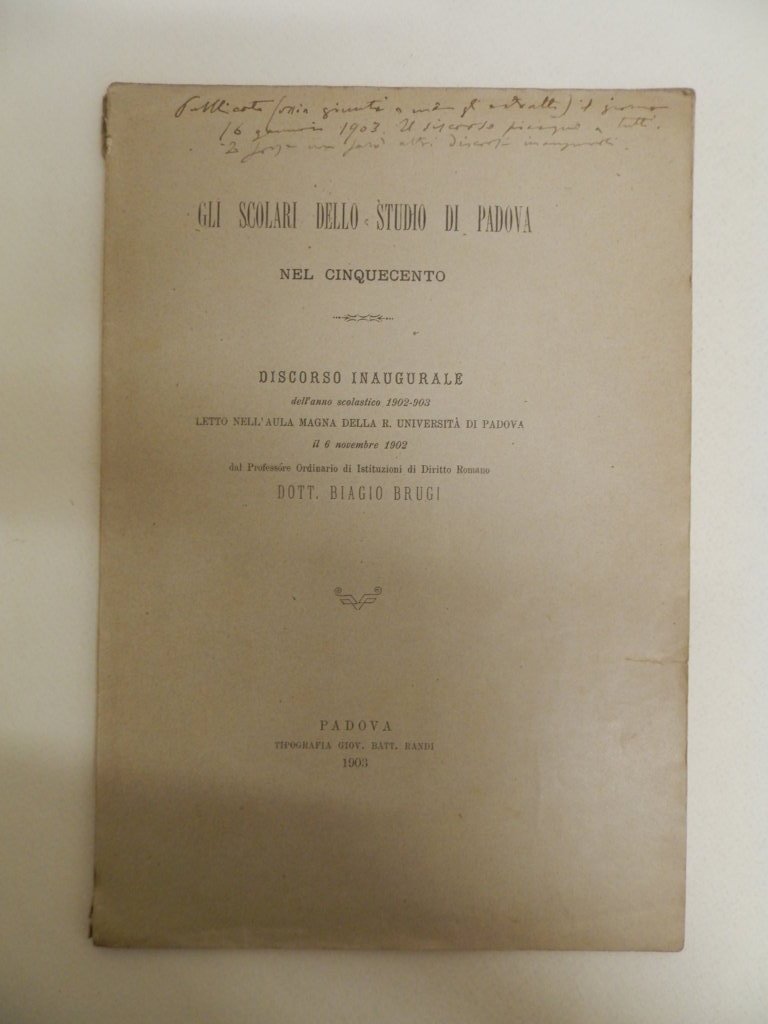 8^, pp. 59, brossura editoriale, titolo al piatto, Discorso inaugurale dell'anno 1902-1903 letto nell'aula magna della R. Università di Padova il 6 novembre 1902. esemplare molto buono. Conservato l'invito a partecipare all'inaugurazione dell'anno accademico e dedica dell'autore autografa alla copertina. *** TUTTI I NOSTRI LIBRI SONO VISIBILI PREVIO CONTATTO MAIL O TELEFONO NELLA NUOVA SEDE DI MILANO: LIBRERIA COSMOPOLIS, VIA JOMMELLI, 22. ***