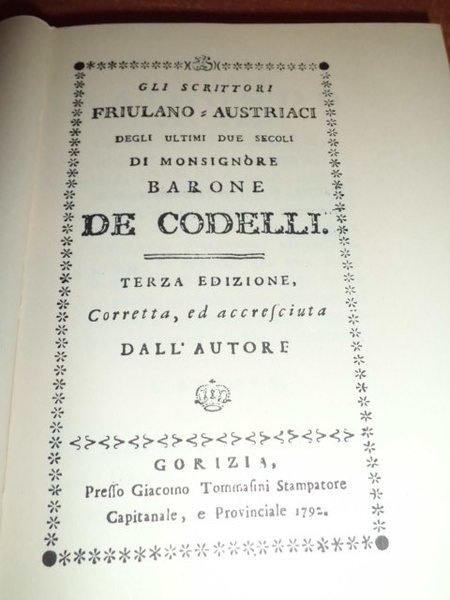 P. A. Codelli. Bologna,Sala Bolognese Arnaldo Forni, 1975. Ristampa fotomeccanica dell' edizione antica. In - 16°, cartoncino edit., con sovracopertina. 253 pp. Esemplare come nuovo. Neg. sotto mass.