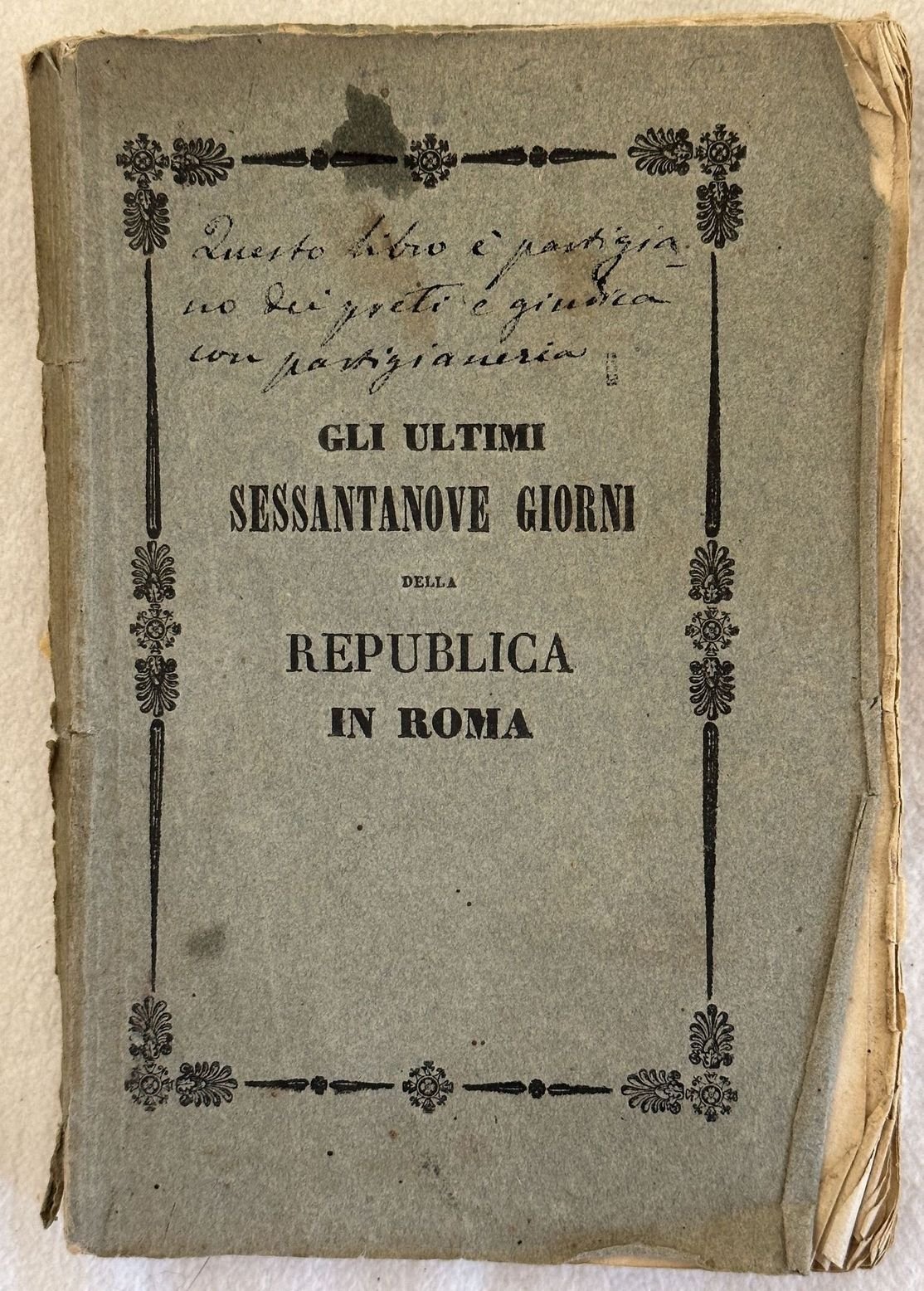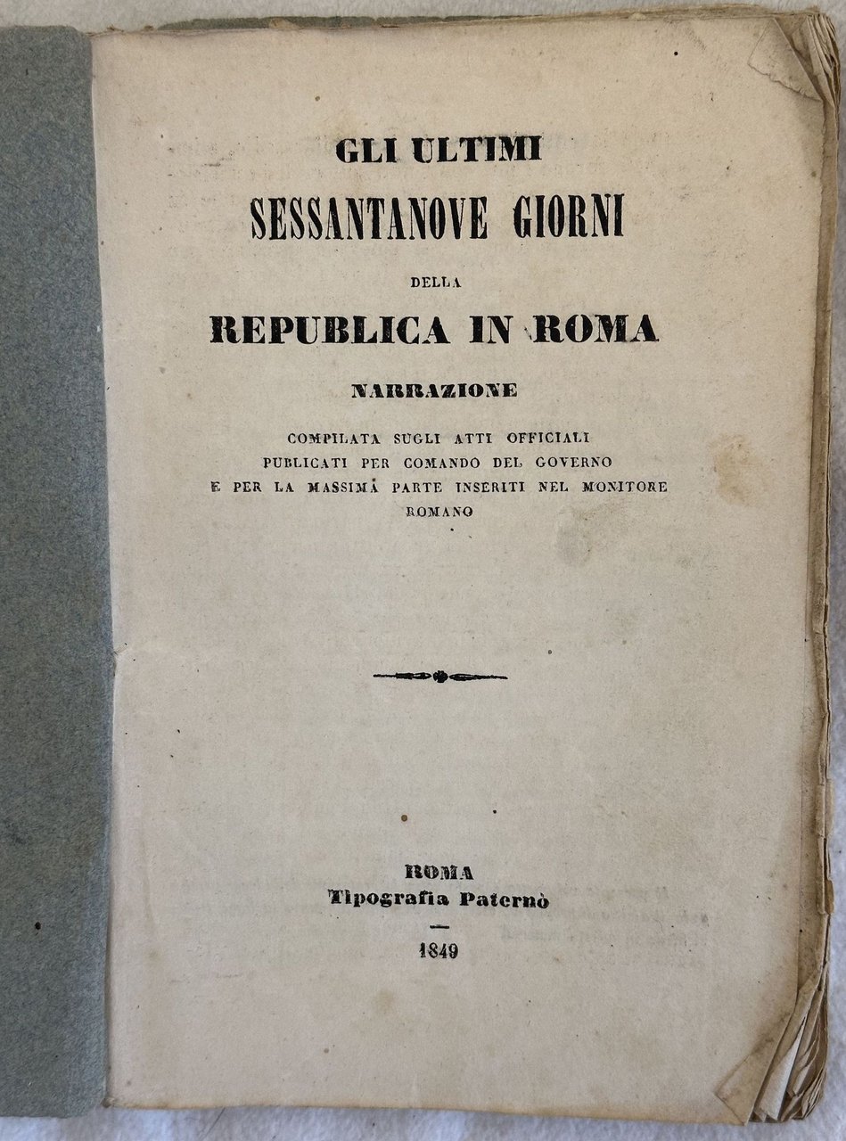 Interessante studio contemporaneo del 1849, gli ultimi sessantanove giorni della Seconda Repubblica Romana (29 marzo-1 luglio 1849). La Repubblica venne costituita a seguito dei grandi moti del 1848 ma terminò con l'intervento militare della Francia di Luigi Napoleone Bonaparte, il futuro Napoleone III. Curiosa antica nota manoscritta in copertina: Questo libro è partigiano dei preti e giudiuca con partigianeria". In buone condizioni. Copertina editoriale in buone condizioni con lievi usure marginali. Piatto posteriore staccato. Legatura in buone condizioni. Pagine in buone condizioni generali con fioriture. Piegature agli angoli. In 16. Dim. 17,5x12 cm. Pp. 166.interesting contemporaryu study of 1849, the last 69 days of second roman Republic (29 marzo-1 luglio 1849). the Republic was establishged soon after the great movement of 1848 but finished with the intervention of Napoleone Bonaparte or Napoleone III. In good conditions. Editorial cover in good conditions lightly worn in the extremities. Back plate is detached. Binding in good general conditions. Pages in good conditions with foxing. Foldings in the corners. In 16. Dim. 17,5x12 cm. Pp. 166.<BR><BR>