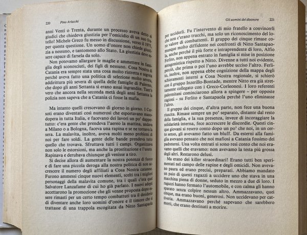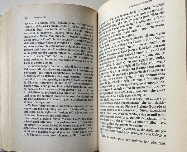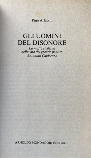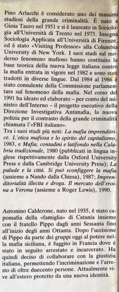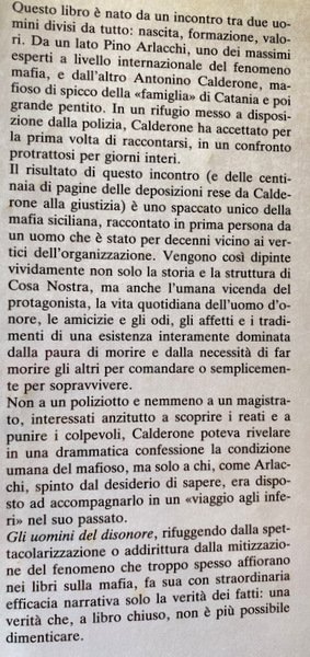 Questo libro è nato da un incontro tra due uomini divisi da tutto: nascita, formazione, valori. Da un lato Pino Arlacchi, uno dei massimi esperti a livello internazionale del fenomeno mafia, e dall'altro Antonino Calderone, mafioso di spicco della «famiglia» di Catania e poi grande pentito. In un rifugio messo a disposizione dalla polizia, Calderone ha accettato per la prima volta di raccontarsi, in un confronto protrattosi per giorni interi.