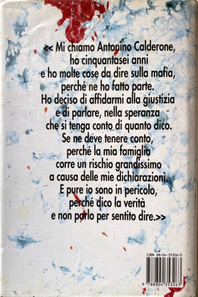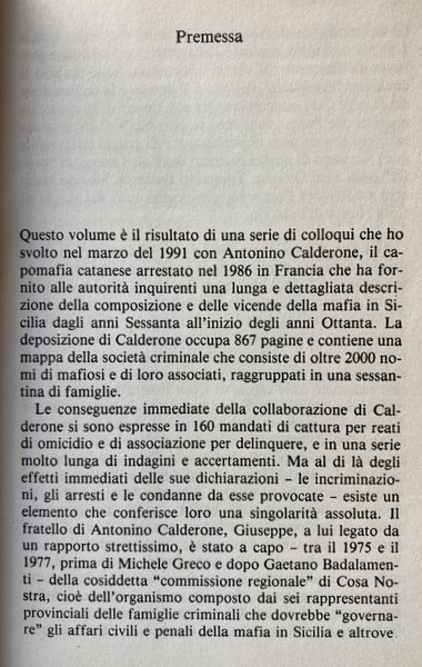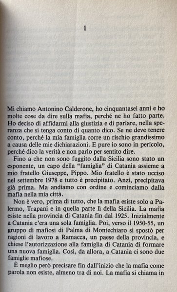 "Mi chiamo Antonino Calderone, ho cinquantasei anni e ho molte cose da dire sulla mafia, perché ne ho fatto parte. Ho deciso di affidarmi alla giustizia e di parlare, nella speranza che si tenga conto di quanto dico. Se ne deve tenere conto, perché la mia famiglia corre un rischio grandissimo a causa delle mie dichiarazioni. E pure io sono in pericolo, perché dico la verità. e non parlo per sentito dire."