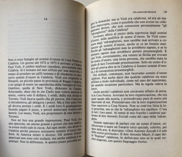 Soggetti: Inchieste, Mafia, Sicilia, Collaboratori, Criminalità organizzata, Cosche mafiose, Cosa Nostra, Affari, Storie vere, Pentitismo, Pentiti, Mafiosi, Memorie, Biografie, Biografia, True crime, Donne, Gangsterismo giovanile, Cavalieri del lavoro, Agip, Omicidi eccellenti, Delitti, Uomini d'onore, Codice, Linguaggio, Affari, Sangue, Iniziazione, Riti, Rituali, Appartenenza, Cultura siciliana, Omertà, Connivenza, Americani, Cavataio, Liggio, Statuto, Ndrangheta, Fratelli Salvo, Massoneria, Terzo livello, Politica, Pippo da Catania, Golpe Borghese, Abuso, Inganno, Figlioccio, Padrino, Contrabbando, Droga, Camorra, Italia, Anni Ottanta, Anni Novanta, Processi, Indagini, Partiti politici, Democrazia Cristiana, Affiliazione, Trattative, Coperture, Arresti, 41 Bis, Leggi, Governo, Giudici, Servizi segreti, Infiltrazioni, Vendetta, Corleonesi, Famiglie, Reati, Criminologia, Nemici, Lealtà, Congiure, Imboscate, Tradimenti, Interno, Vita quotidiana, Amicizie, Affetti, Boss, Etica mafiosa, Nuove generazioni, Malaffare organizzato, Condanne, Pene, Carcere duro, Isolamento, Ergastolo, Legislazione antimafia italiana, Dia, Sfida, Rocco Chinnici, Giovanni Falcone, Paolo Borsellino, Generale Nando Dalla Chiesa, Confessioni, Tommaso Buscetta, Strategia stragista, Direzione Investigativa Antimafia, Ministero degli Interni, Superprocura, Polizia, Segreti di Stato, Vincenzo Parisi, Prima repubblica, Capomafia, Bestsellers, Successi editoriali, Finanza criminale, Servizi deviati, Episodi, Testimoni, Legami, Esponenti, Forze dell'ordine, Magistratura, Dopoguerra, Anni settanta, 1984, Riforma, Legge Rognoni-La Torre, Sequestro dei beni, Giulio Andreotti, Leonardo Vitale, Associazione mafiosa, Melchiorre Allegra, Interrogatori, Maxiprocesso, Greco, Gambino-Bontade-Spatola, Inzerillo, Badalamenti, Mercati illeciti, Traffici internazionali, Network, Blitz, Boris Giuliano, Vito Ciancimino, Stampa, Editoria, Stati Uniti, Elezioni, Ciaculli, Palermo, Caltanissetta, Agrigento, Edilizia, Appalti, Turismo, Commercio, Agricoltura, Banche, Illegalità, Economia, Armi, P2, Antonino Caponnetto, Logge massoniche, Licio Gelli, Latitanza, Latitanti, Sudamerica, Lobby, Elio Pizzuti, Attentati, Pippo Calò, Cellula romana, Pierluigi Vigna, Commissione, Salvatore Contorno, Vertici, Onorevole, Lima, Corrado Carnevale, Corte di Cassazione, Partito Socialista, Caso Tortora, Garantismo, Partito Radicale, Provenzano, Vernengo, Santapaola, Greco, Madonìa, Giuseppe Insalaco, Antonino Meli, Commissario Cassarà, PSI, Leoluca Orlando, Antonio Saetta, Mauro Rostagno, Trapani, Carabinieri, Emanuele Basile, Estorsioni, Antonino Scopelliti, Libero Grassi, Arnaldo Valente, Martelli, Brancaccio, Giacomo Giuseppe Gambino, Gaspare Mutolo, Pianosa, Asinara, Antonio Gava, Bettino Craxi, Addaura, Scienze sociali, Libri Vintage Fuori catalogo, Pippo Fava Manganelli, De Gennaro, Investigations, Sicily, Collaborators, Organized crime, Gangs, Business, True stories, Pentitism, Repent, Mafia members, Memories, Biographies, Biography, Women, Youth gangsterism, Knights of labor, Super murders, Crimes, Men of honor, Code, Language, Business, Blood, Initiation, Rites, Rituals, Belonging, Sicilian culture, Connivance, Americans, Statute, Freemasonry, Third level, Politics, Coup, Abuse, Deception, Godfather, Smuggling, Drugs, Italy, Eighties, Nineties, Trials, Investigations, Political parties, Christian Democracy, Affiliation, Negotiations, Covers, Arrests, Laws, Government, Judges, Secret services, Infiltrations, Revenge, Corleonesi, Families, Criminology, Enemies, Loyalty, Conspiracies, Ambushes, Betrayals, Internal, Daily life, Friendships, Affections, Ethics, New generations, Organized malpractice, Sentences, Penalties, Hard prison, Isolation, Life imprisonment, legislation, Challenge, Confessions, Massacre strategy, Ministry of the Interior, Superpower of attorney, Police, State secrets, First Republic, Mafia boss, Editorial successes, Criminal finance, Deviated services, Episodes, Witnesses, Ties, Exponents, Law enforcement, Judiciary, Postwar period, Seventies, Reformation, Seizure of assets, Interrogations, Illicit markets, International trade, Press, Publishing, United States, Elections, Construction, Procurement, Tourism, Commerce, Agriculture, Banks, Illegality, Economy, Weapons, Masonic Lodges, Inaction, Fugitives, South, Attacks, Roman cell, Commission, Summits, Court of Cassation, Socialist Party, Guarantee, Radical Party, Carabinieri Commissioner, Extortions, Social sciences, Out of print books